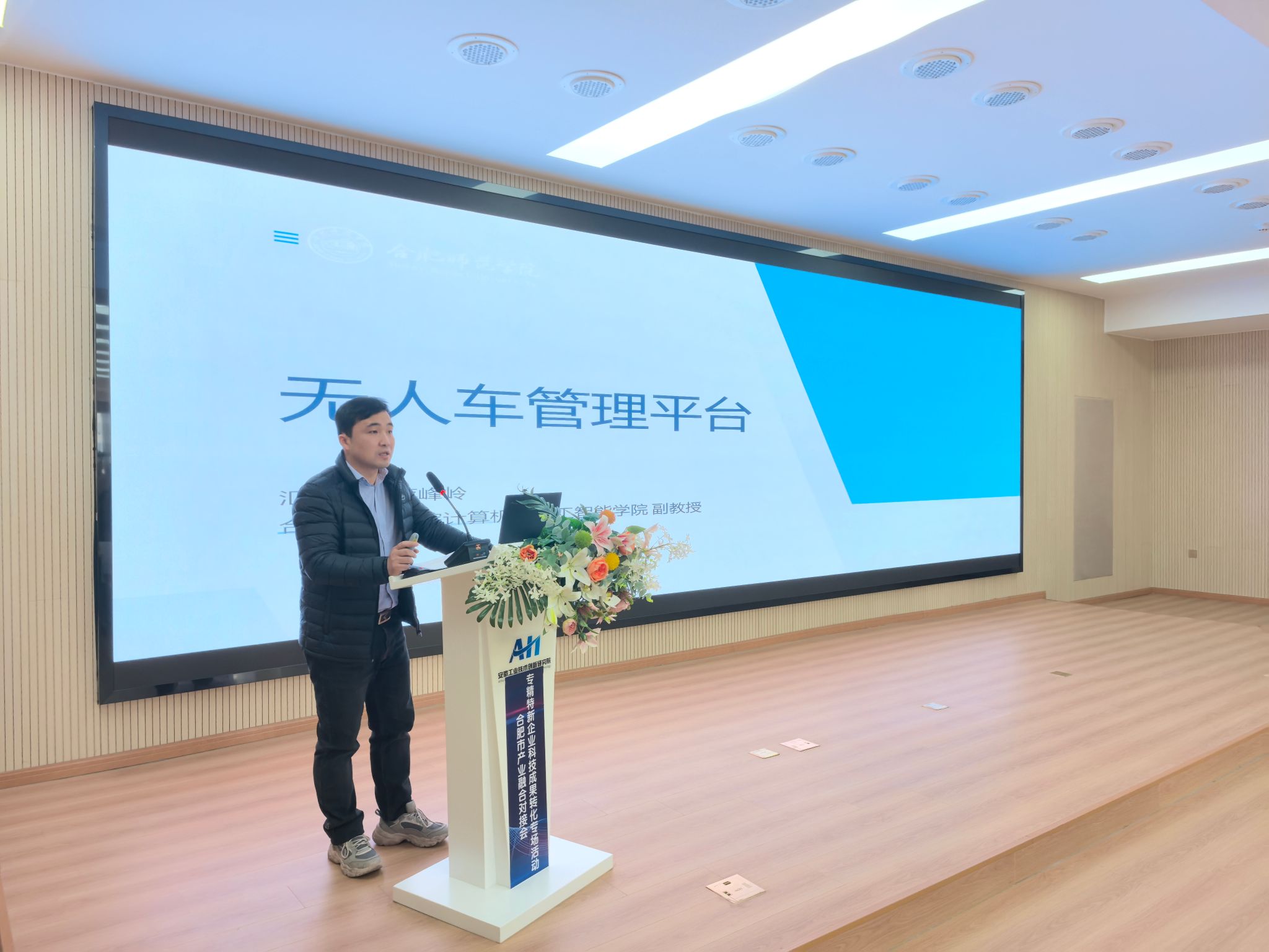 对接会上,我院计算机与人工智能学院副教授蒋峰岭就“无人车管理平台”进行了技术产品路演展示,中国科学院合肥物质科学研究院副研究员章文扬就“智慧储能”进行科技成果路演,安徽长龙电气集团有限公司、合肥合滨智能机器人有限公司分别进行技术需求路演。