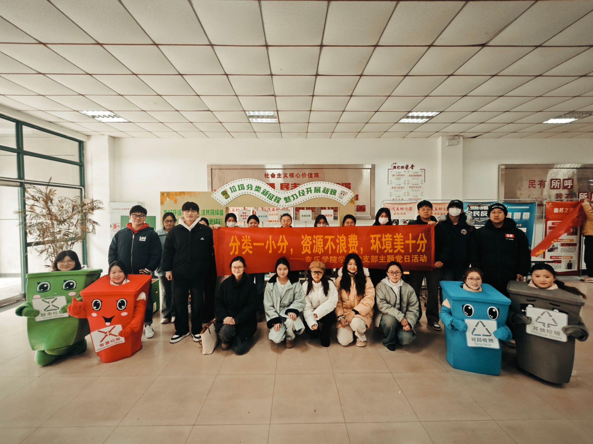 2月22日上午,beat365中文官方网站音乐学院学生党支部联合合肥市江汽五村小区党群服务中心,组织开展“分类一小分,资源不浪费,环境美十分”主题党日活动。二十余名学生党员深入社区,通过宣传讲解、互动体验、实践指导等形式,助力提升居民垃圾分类意识,推动环保理念落地生根。