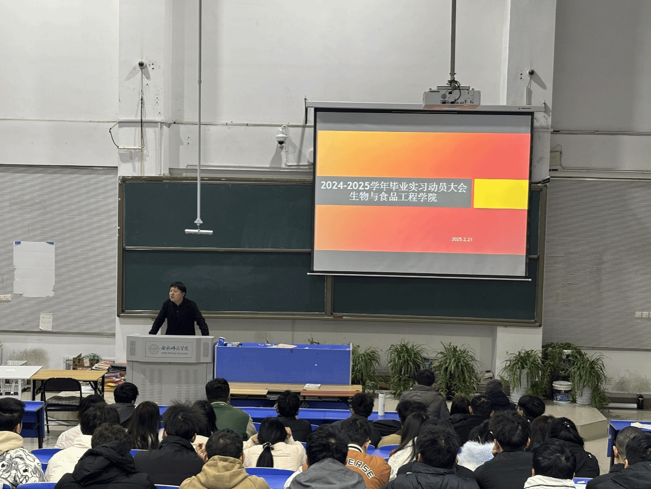 为确保2025届毕业生毕业实习工作正常有序开展,提升学生实践能力,2月21日,生物与食品工程学院在逸夫楼西阶1教室召开2025年度毕业实习动员大会,全面部署毕业实习工作。学院实践教学部主任张雁,指导教师杨俊杰、王恒生、张海玲,辅导员李万成、黄洁,2021级生物技术、生物制药和食品质量与安全专业全体学生参加动员大会,会议由张雁主持。