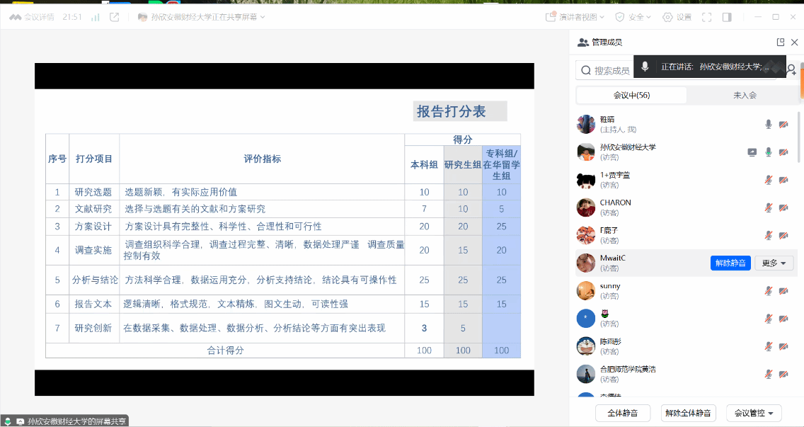 孙欣教授从大赛评分标准、报告评审规则、答辩环节评审要点三个方面向指导教师和同学们展开详尽的分享。关于大赛评分标准,孙教授详细剖析研究选题、文献研究、方案设计等七个打分项目的评价指标,明确不同组别评分差异。在报告评审规则讲解环节,孙教授结合历届大赛丰富的选题案例,分析大学生类、市场类、社会类选题特点及策略。针对答辩环节,孙教授介绍 PPT 展示和现场展示评审要点,分享 PPT 制作技巧,鼓励学生采用新闻发布会、小品等多样方式展现调研成果。
