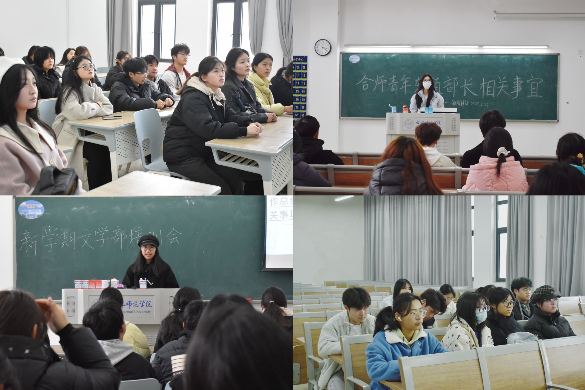 在业务能力培训阶段,各部门负责人担任主讲人,结合自身实践经验,结合新媒体编辑、新闻稿件撰写、视效制作、文稿编辑、舆情识别与应对等内容展开案例分享与技巧解析,并围绕青年文化创作、校媒专业素养、新学期中心工作等话题展开探讨与交流。在规章制度培训阶段,依据《合师青年传媒中心规章制度集》,围绕轮值部长制度、稿件录用制度、考核制度、选题制度、编校审制度、培训制度等进行集中培训。
