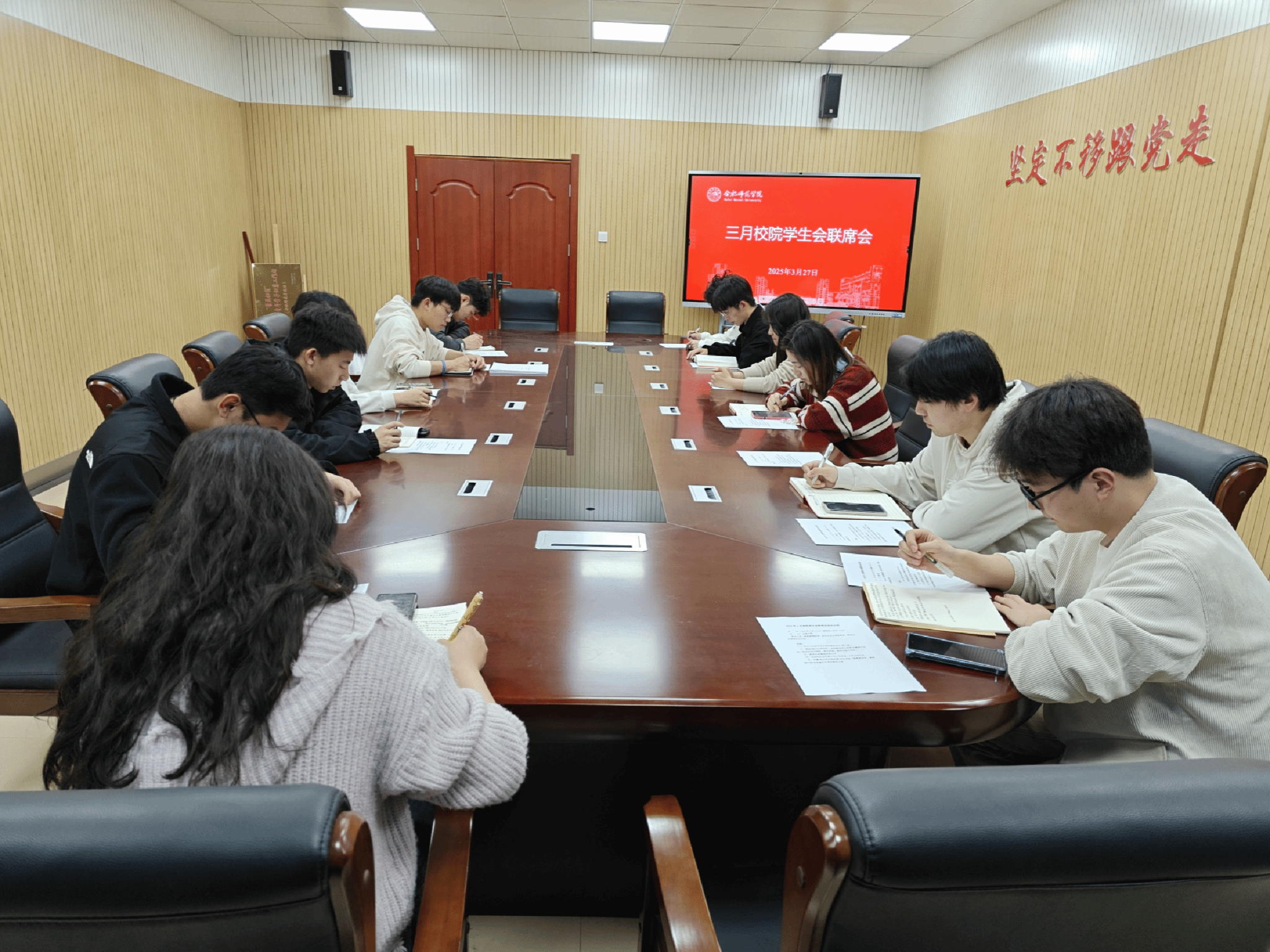 3月27日中午,2025年3月校院学生会联席会议在锦绣校区共青之家会议室召开,院学生会秘书长、院学生会主席团成员和各二级学院学生会春季执行主席参加本次会议。