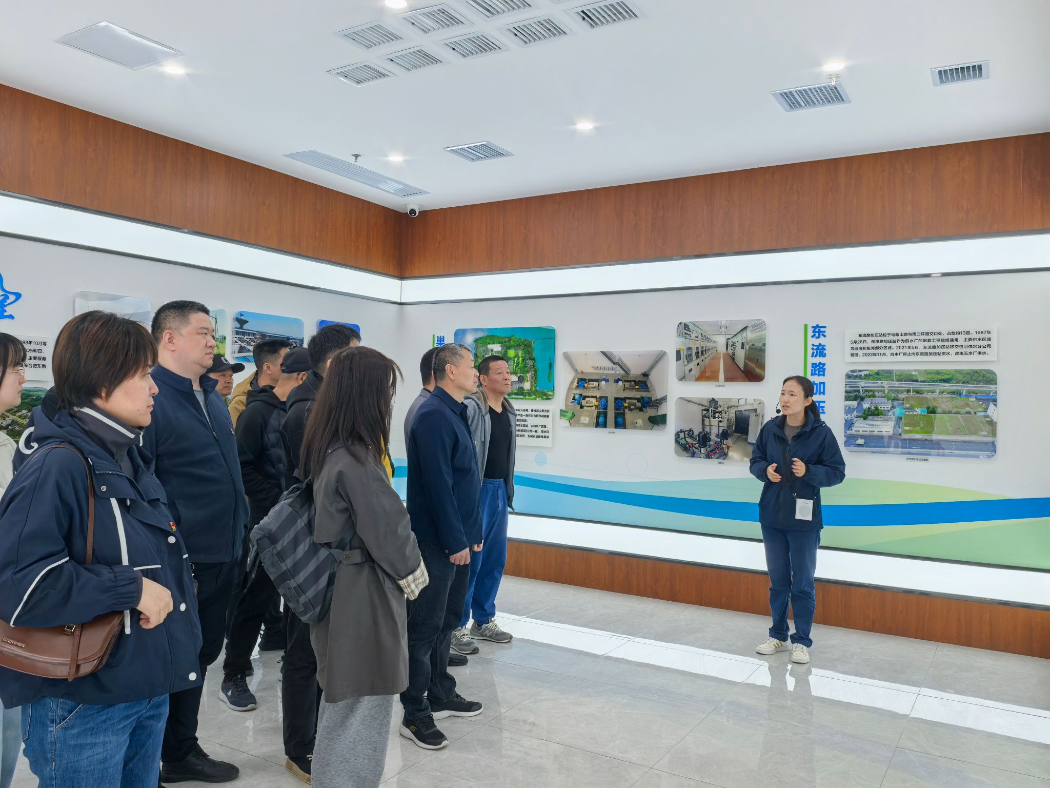 四水厂支部在展室介绍了本厂发展历程;在中控室,通过智慧生产宣传片展示了自来水制水工艺、深度处理、智慧水务建设及数字化智能化在制水工艺上的广泛使用。随后,党员们实地参观了水厂沉淀池、滤池、加药间、化验室及尾水处理设施、清水库等现场重要区域设施,工作人员详细介绍了四水厂原水预处理、智能加药、混凝沉淀、过滤消毒等关键环节,现场感受自来水的整个生产过程。