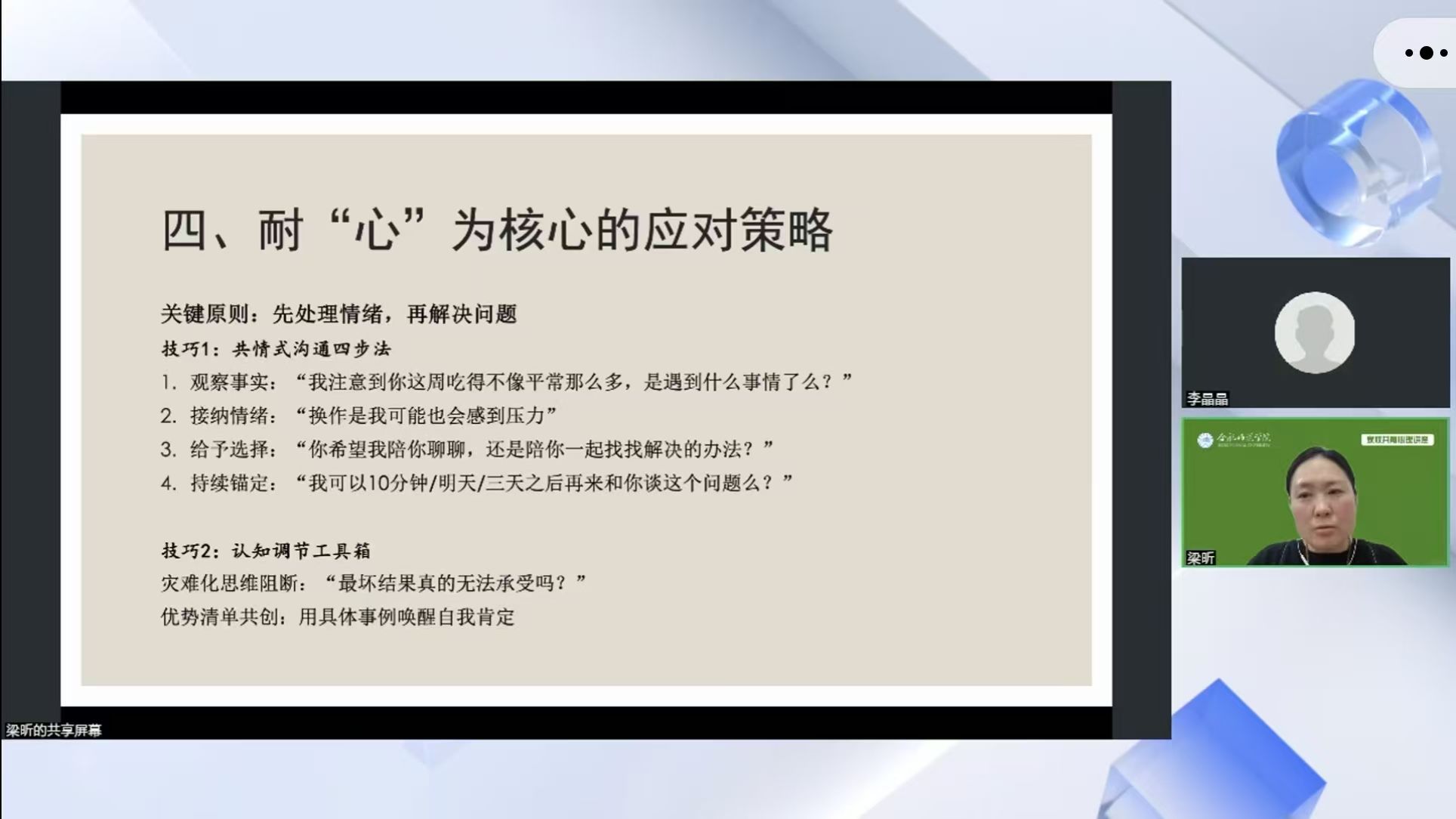 “教育离不开学校,但更离不开家庭”,家庭是心理教育的天然环境,更是心理健康的重要基石。学院持续组织开展“家校共育”线上心理讲堂,至今已有三期。通过线上讲堂的形式,进一步加强学校与家庭的联合协作,强化家校共育的意识理念,促进育人合力,共同维护学生的心理健康。(学生工作处)