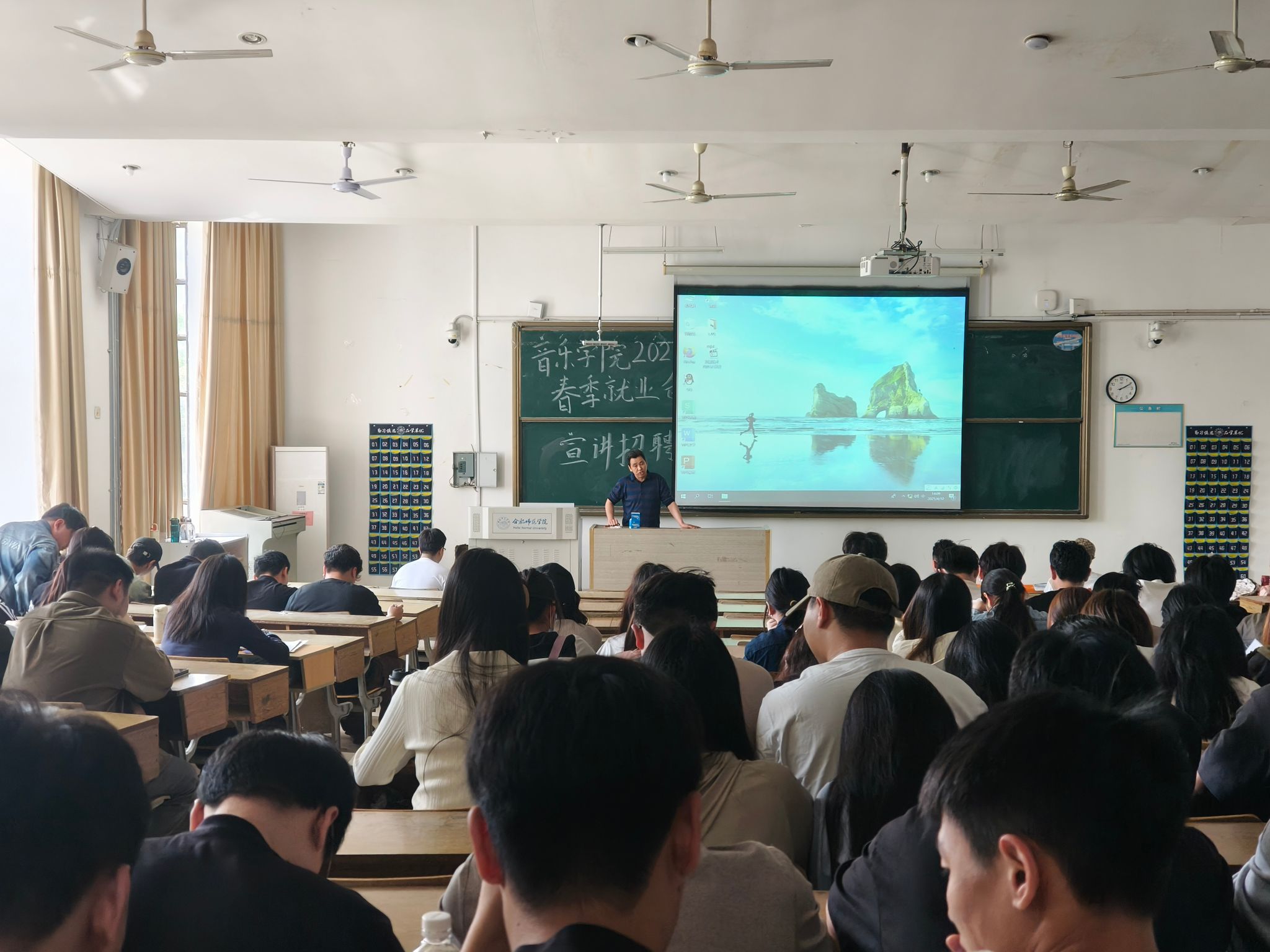 为扎实推进2025届毕业生就业创业工作,搭建优质就业平台,深化校企合作,助力人才培养与产业需求精准对接。 4月10日下午2点,音乐学院2025届毕业生春季专场招聘会在博约楼101举行,音乐学院党委副书记宋辉及2025届全体毕业生参加了本次招聘宣讲会,会议由王岩主持。