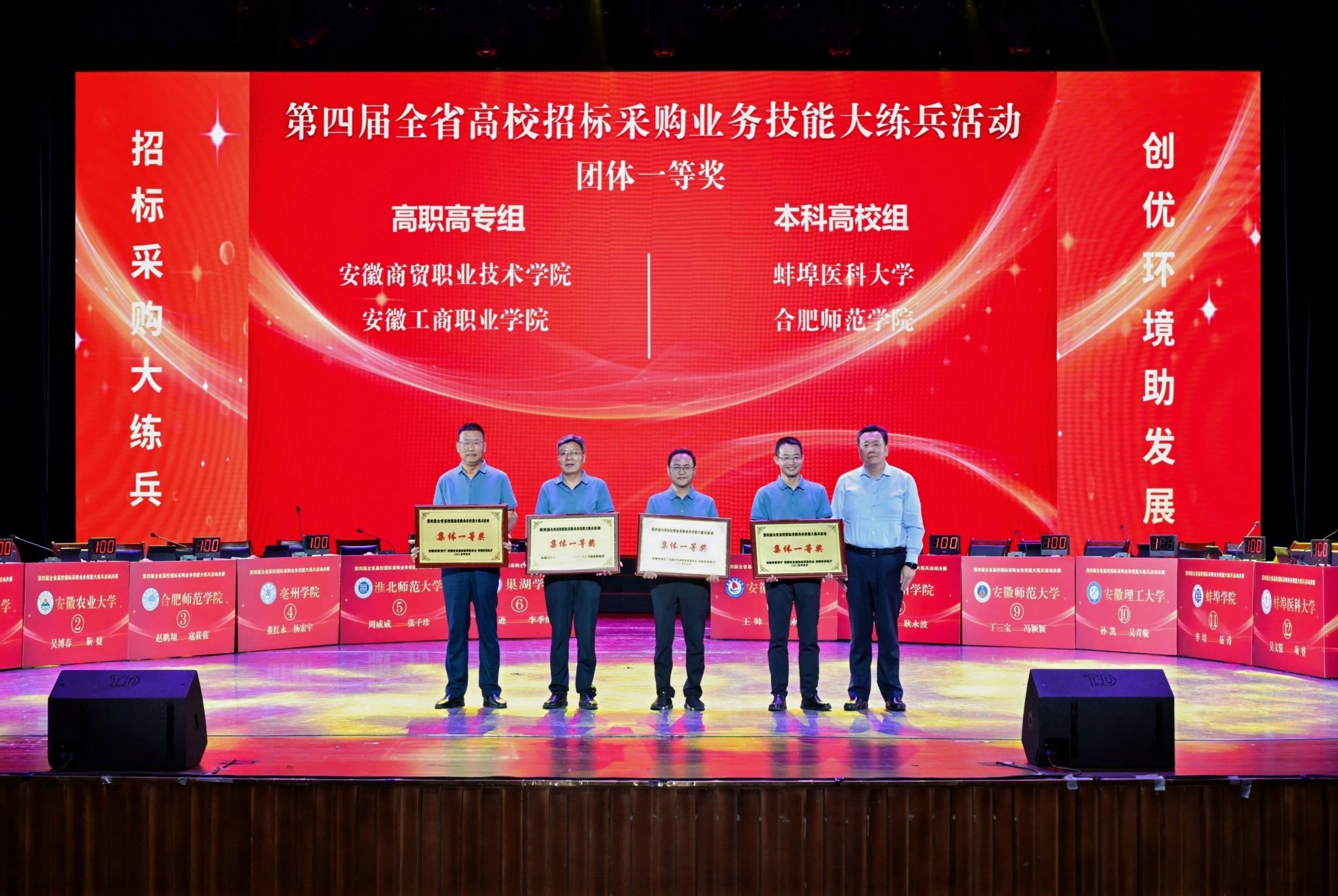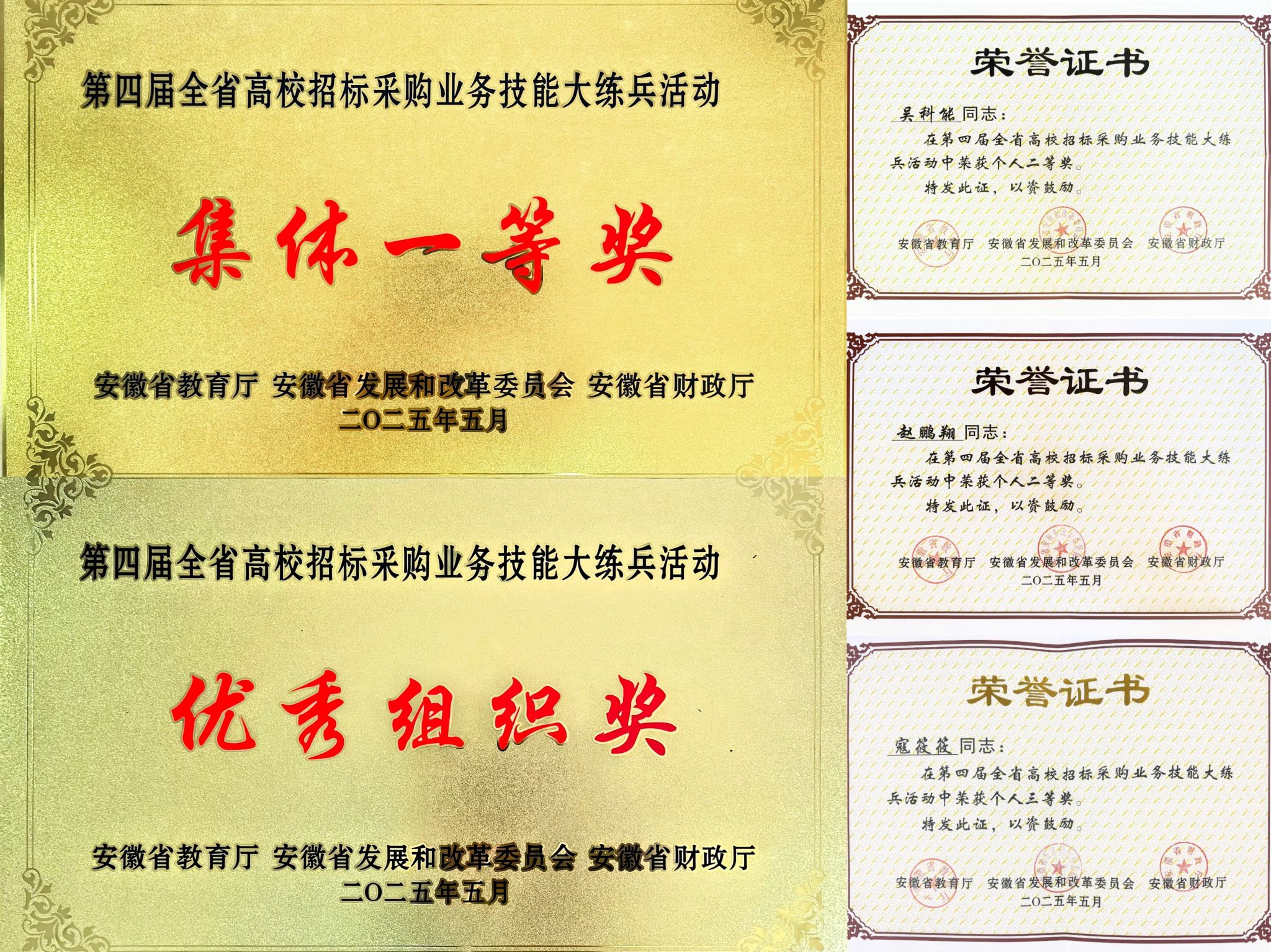 5月29日,在安徽省发改委、安徽省财政厅、安徽省教育厅联合举办的第四届全省高校招标采购业务技能大练兵活动决赛中,由吴科能同志领队,赵鹏翔、寇筱筱两位同志代表学校参赛,为学校争得本科高校组“集体一等奖”和“优秀组织奖”两项荣誉。本次大练兵活动旨在强化全省高校依法采购意识,激发采购业务学习热情,提升采购专业化水平。全省进入决赛的25所高校代表和个人奖获得者78人参加决赛。