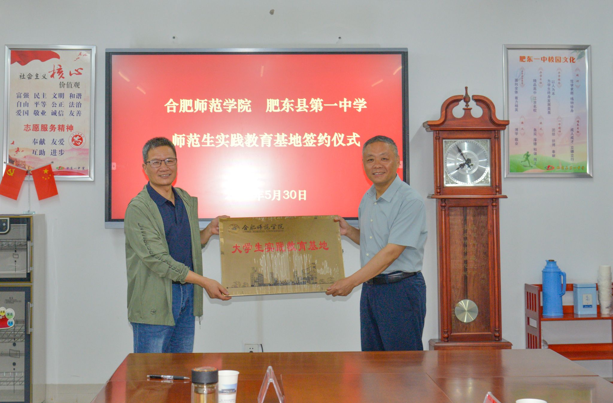 期间,何光辉代表学院与肥东一中签订了实践基地协议,并举行了“大学生实践教育基地”授牌仪式。
