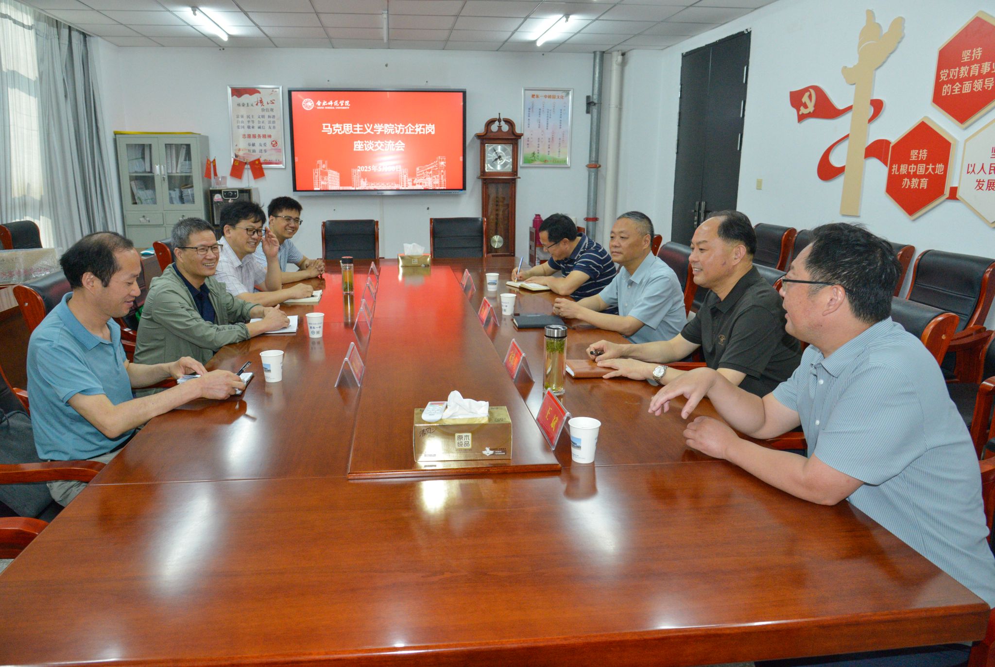 为进一步加强校校合作,拓宽研究生和本科生实习就业渠道,5月30日上午,马克思主义学院院长何光辉一行4人,赴肥东一中学开展访校拓岗活动。肥东一中党委书记杨梓、校长宋汝明、副校长陈章松、副校长王斌参加座谈会,座谈会由副校长王斌主持。