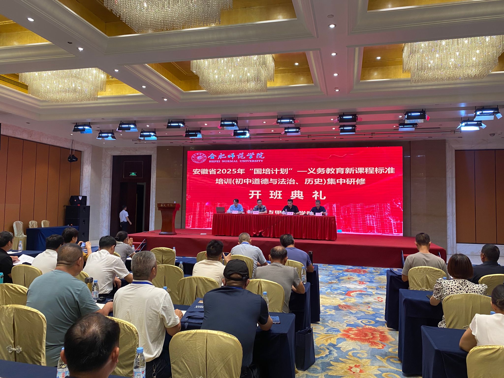 7月27日上午,由马克思主义学院承办的安徽省2025年“国培计划”——义务教育新课程标准(道德与法治、历史)教师集中研修班在合肥丰大酒店开班。学校继续教育学院副院长王磊、合肥市教育科学研究院思政教研员侯新旺、马克思主义学院副院长方政等相关领导出席开班典礼。来自全省各地300名老师参加开班仪式,仪式由马克思主义学院院长何光辉主持。
