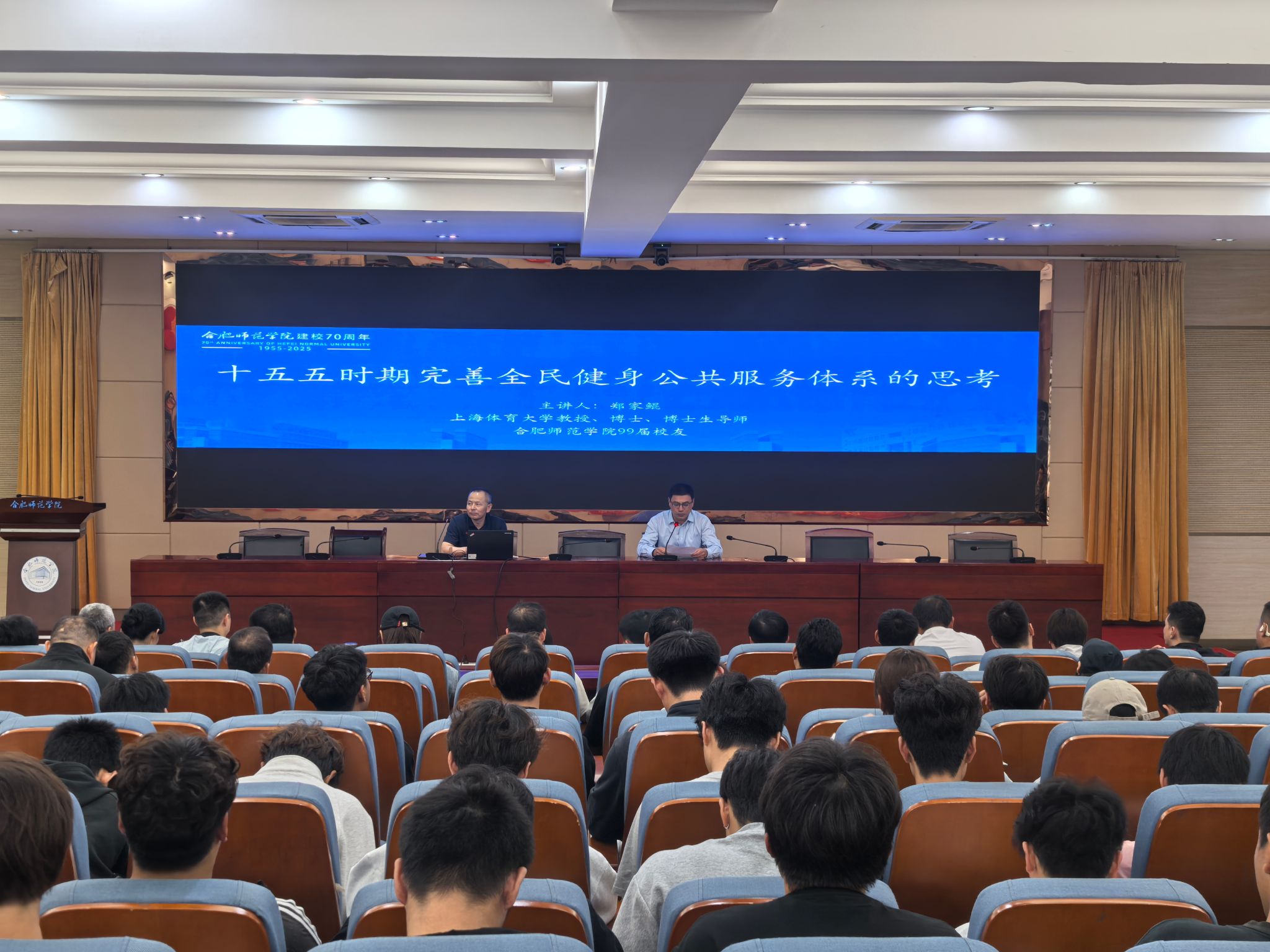 时值beat365中文官方网站建校70周年,校园内洋溢着喜庆与学术交融的浓厚氛围。9月24日下午,99届杰出校友、上海体育大学教授、博士生导师郑家鲲应邀重返母校,在锦绣校区学术报告厅为体育科学学院师生带来了一场题为“‘十五五’时期完善全民健身公共服务体系的思考” 的精彩学术报告。本次报告不仅是校庆系列学术活动的重要组成部分,也为师生提供了一次与前沿体育政策研究深度对话的宝贵机会。