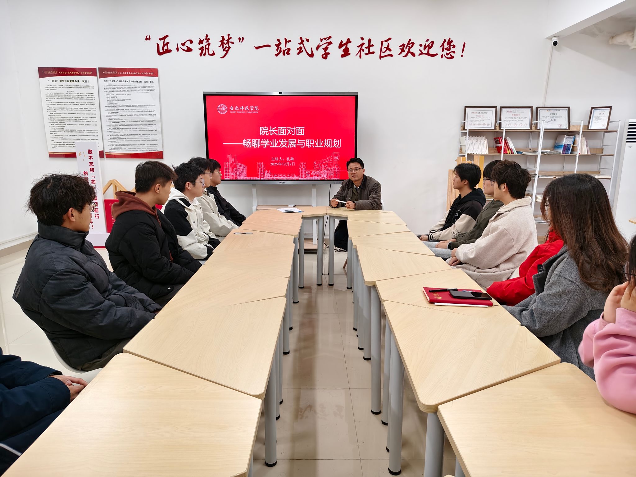 为精准回应学生在学业深造、职业选择上的普遍关切,电子信息与集成电路学院于12月2日在“匠心筑梦”一站式学生社区举办“院长面对面”专题活动。学院副院长孔勐教授与2023级学生代表围坐交流,聚焦专业发展与个人规划,展开了一场务实而深入的对话,将育人力量直接延伸到学生生活的最小单元。