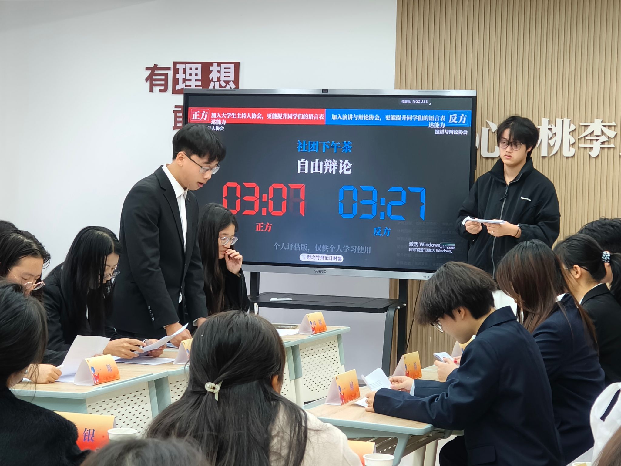 活动在主持人协会及演讲与辩论协会的风采展示中拉开序幕,主持人协会同学们朗诵《天路》,讲述了铁路修筑的不易与建设者的奉献,用真挚饱满的情感赢得现场掌声。演讲与辩论协会展示了社团活动成果,分享了社团在语言训练中的实践经验。随后,两个社团成员围绕“加入主持人协会还是演讲与辩论协会,更能提升语言表达能力”主题展开辩论。