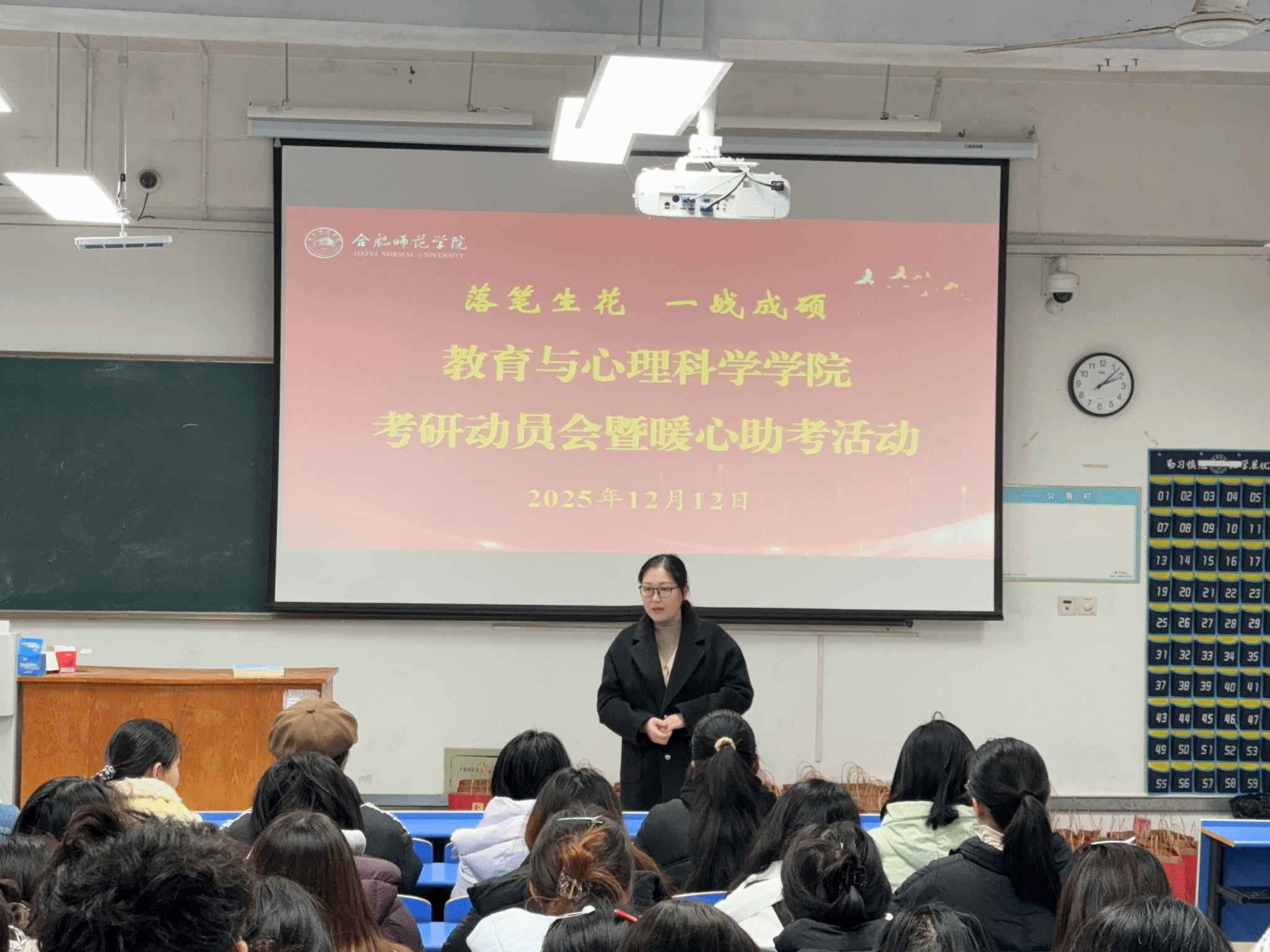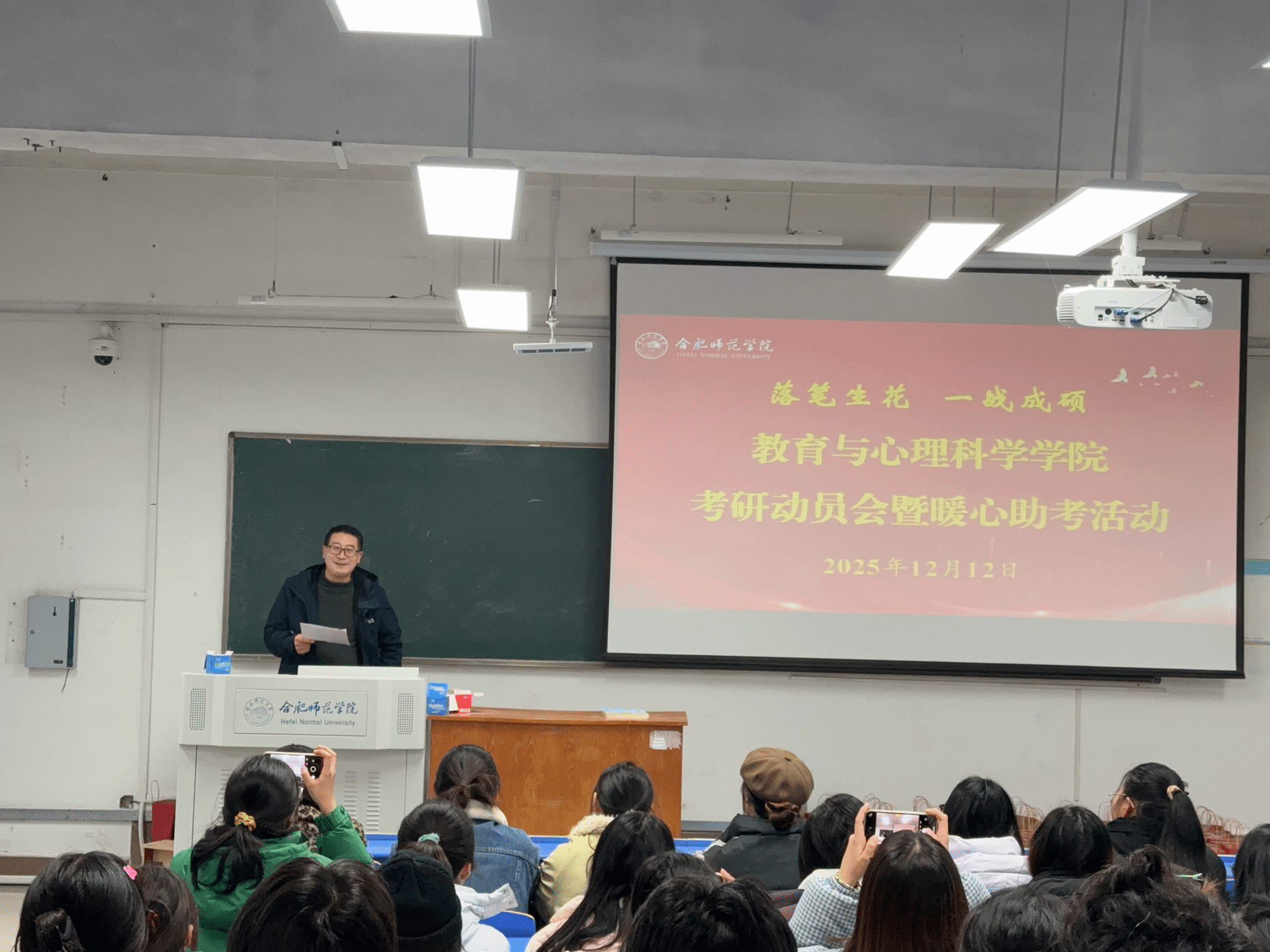 岁寒情暖,护航研梦。为深入贯彻落实立德树人根本任务,切实做好2026届毕业生考研指导与服务保障工作,12月12日下午,教育与心理科学学院在锦绣校区逸夫楼A106举办2026届考研动员会暨暖心助考活动。教育与心理科学学院党委书记董萍、党委副书记陈帅、副院长胡连峰、教师代表李辉、全体毕业班辅导员与100余名考研学生齐聚一堂、亲切交流,以实际行动为学子们加油鼓劲,传递学院的深切关怀与温暖支持。