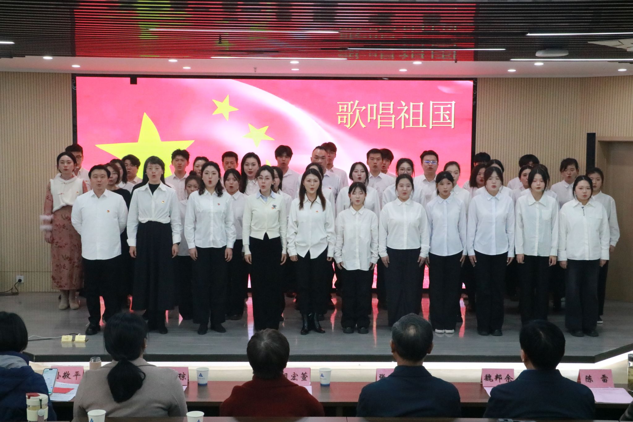 本次音乐党课以“音乐经典+历史述说”为主线,通过演唱的形式,以年代线串联起抗战岁月与新时代发展的红色脉络,由音乐学院声乐系、钢琴系教工党支部的所有党员教师和部分学生参演,整场演出涵盖独唱、合唱等多种艺术形式,精选了《松花江上》、《毕业歌》、《义勇军进行曲》、《没有共产党就没有新中国》、《延安颂》等12首经典红色歌曲,都是大家耳熟能详的曲目。旋律与歌声交织,生动再现了革命先辈的爱国情怀与奋斗精神。音乐党课在全体师生共同演唱的一首激昂的《歌唱祖国》中落下帷幕。
