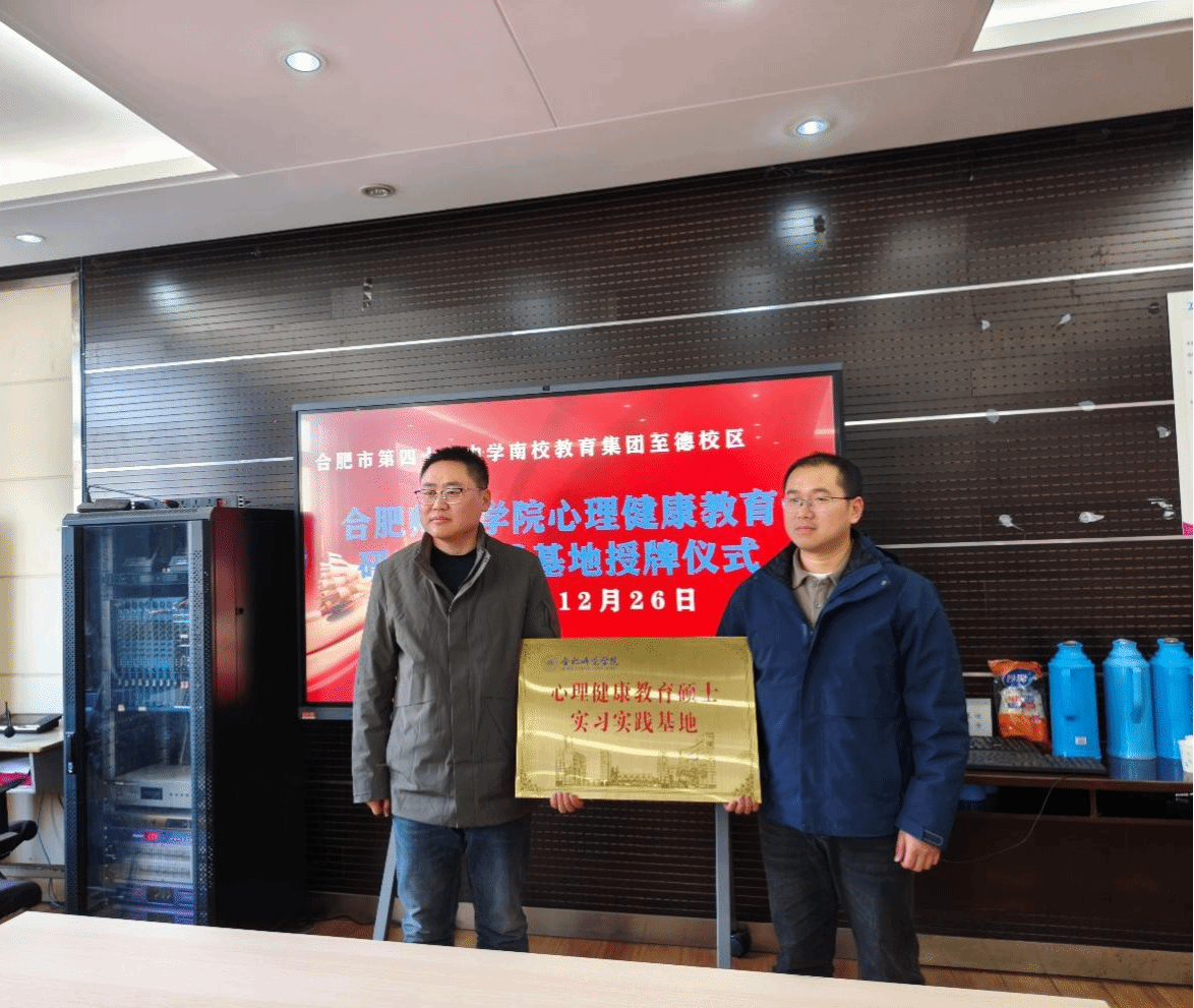 为加强学院与基础教育学校实习实训和就业等方面的合作交流,进一步提高心理健康教育硕士研究生人才培养质量,推进beat365中文官方网站心理健康教育硕士联合培养示范基地建设,12月26日下午,教育与心理科学学院副院长胡哲带队走访心理健康教育硕士实习实践基地“合肥市第四十六中学南校教育集团至德校区”,并进行座谈交流和基地签约授牌仪式。