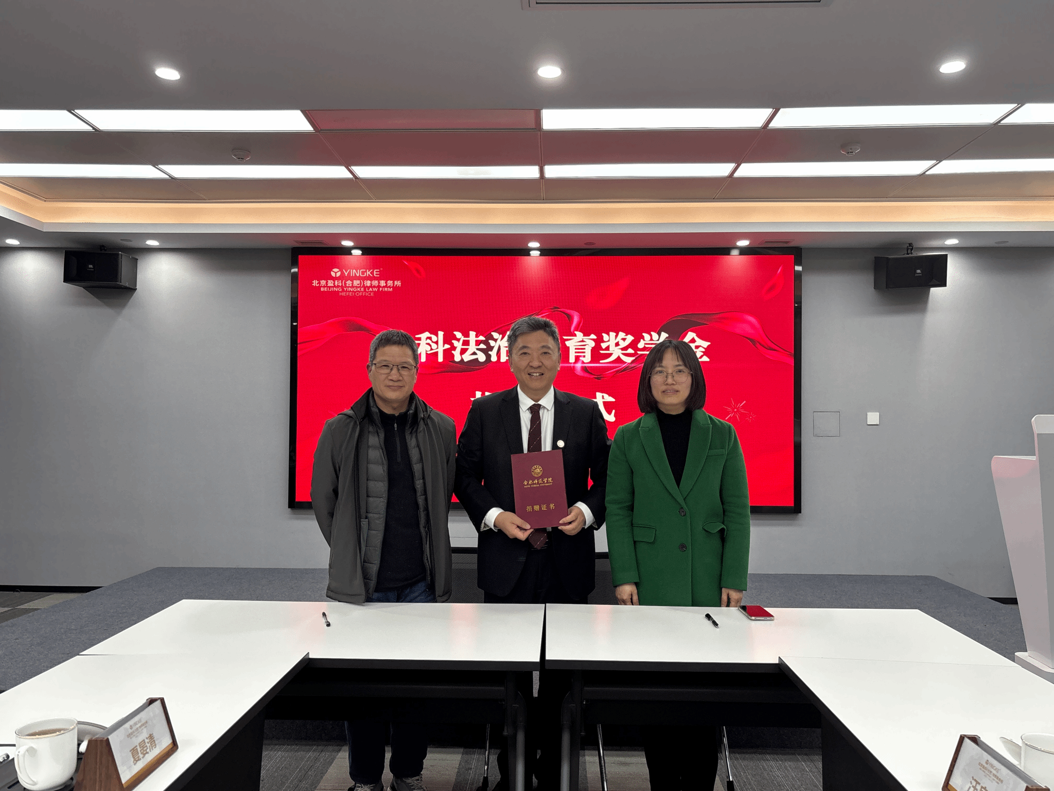 3月3日下午,马克思主义学院“盈科法治教育奖学金”设立仪式在北京盈科(合肥)律师事务所会议室举行。1991届校友、盈科合肥刑事法律事务部主任、校法律顾问胡瑾律师再次捐赠10万元用于奖励思想政治专业品学兼优本科生,院党委书记刘艳、院长何光辉、副书记吴世红,盈科安徽区域管委会主任付磊,盈科合肥执行副主任胡珊及校友代表等共同出席仪式。