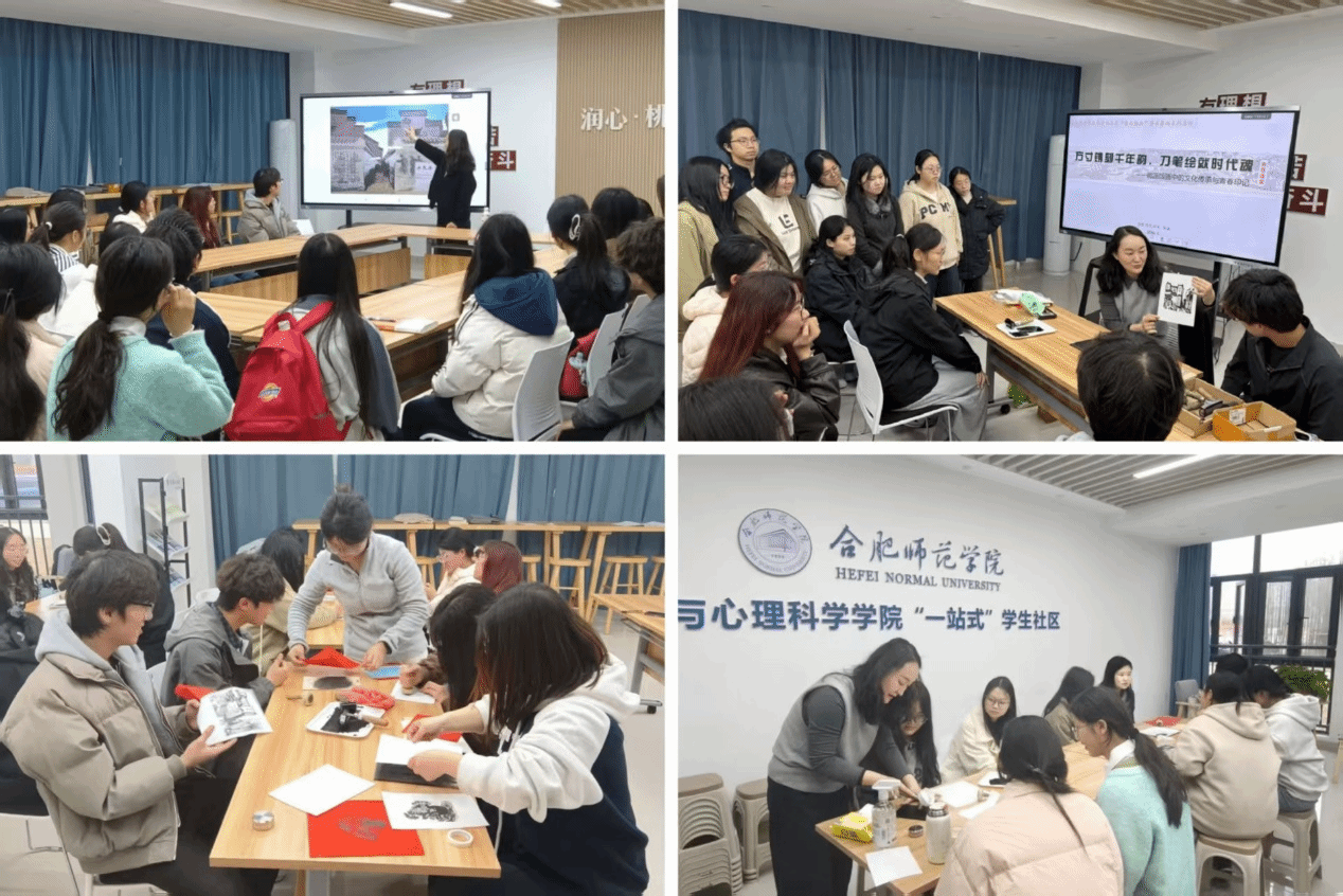 3月26日,教育与心理科学学院在滨湖校区“润心·桃李”工作坊一站式学生社区举办第2期《青春夜校》。本次活动以徽派版画非遗文化体验为切入点,吸引来自不同专业的学生齐聚一堂,共同在刀笔方寸间探寻中华美学的千年韵律,亲身实践了一场生动的跨学科融合课堂。