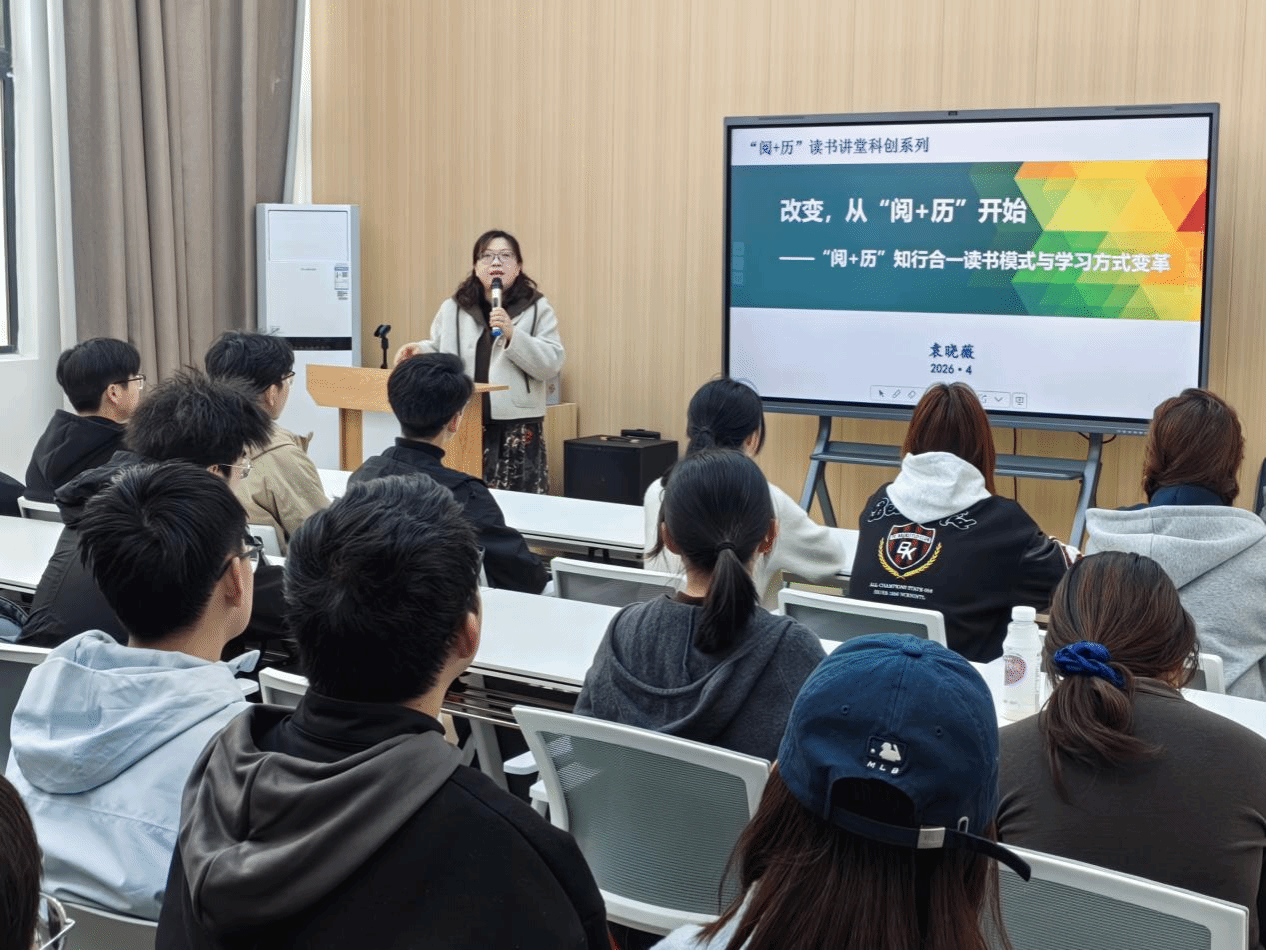 4月1日下午,滨湖校区“阅+历”读书讲堂如期举行。本期讲堂特邀文学院教授、文学博士、省教学名师袁晓薇担任主讲嘉宾,以《改变,从“阅+历”开始——“阅+历”知行合一读书模式与学习方式变革》为题展开分享,外国语学院教师吴蓓主持,60余位选课学生到场聆听。