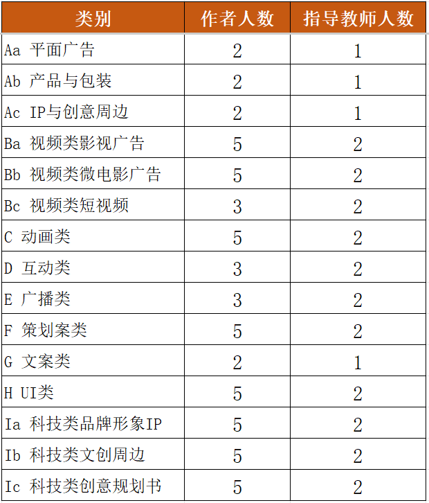 1.作者人数:平面类、文案类不超过2人/组;短视频、互动类、广播类不超过3人/组;影视广告、微电影广告、动画类、策划案类、UI类、科技类、营销创客类不超过5人/组。