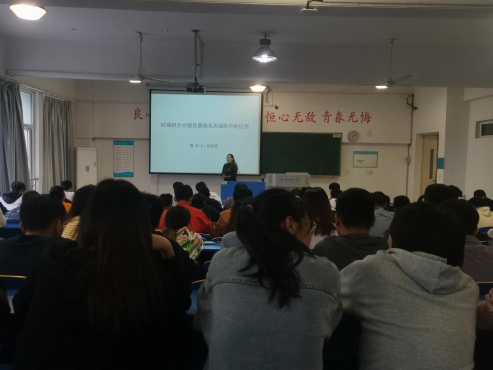 胡金花老师首先从电磁场理论出发,介绍了电磁波传播和圆极化阵列天线的相关知识,并向同学们详细介绍了目前国内外电磁场数值计算方法的发展前沿。在报告中,胡金花老师解读了时域积分方程方法的优点,认为由于时域积分方程方法综合了时域方法和积分方法两者的优点,特别适用于对圆极化阵列天线的瞬态电磁散射特性、辐射特性进行分析和研究。最后,结合科研经历,胡金花老师深入浅出地讲解了如何做基于时域积分方程方法的圆极化阵列天线的建模。