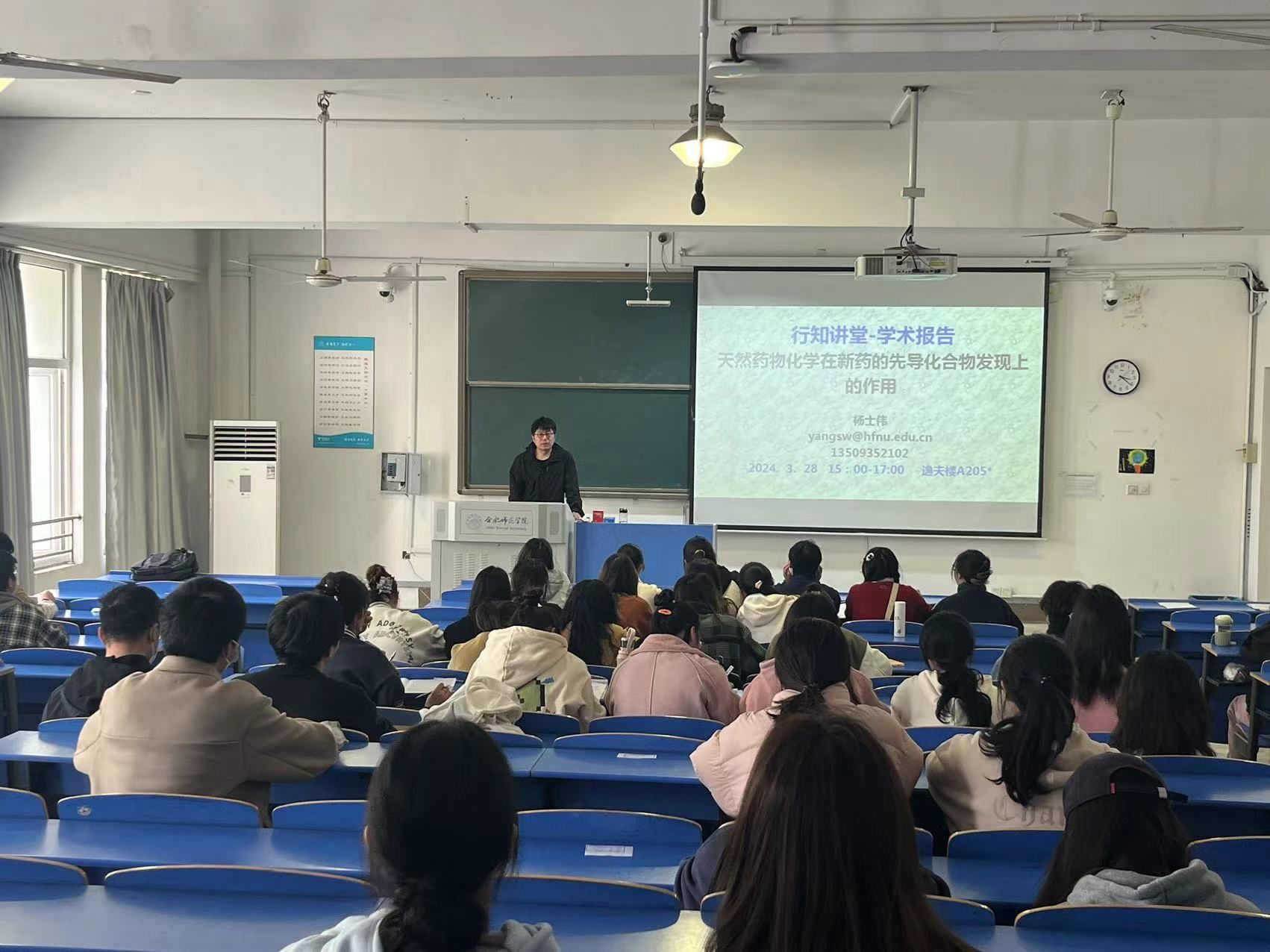3月28日下午,化学与制药工程学院杨士伟老师在锦绣校区逸夫楼A205教室做了题为“天然药物化学在新药的先导化合物发现上的作用”的学术报告,20级制药工程,22级制药工程,23级制药工程等专业的100多名学生参加了报告会。