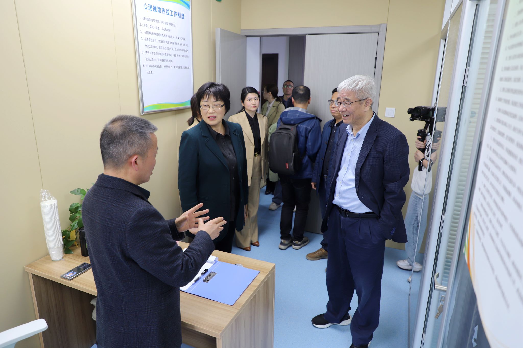 讲座结束后,院长方东玲邀请高天明院士前往建在我院的安徽省学生心理健康教育指导和发展中心,青少年心理健康与危机智能干预省级重点实验室参观,并和聆听讲座的师生座谈,就人才培养、科研合作、大中小学心理健康教育等方面进行了广泛而深入地交流和探讨。师生热情不减,踊跃提问,争相与高天明院士交流、合影。