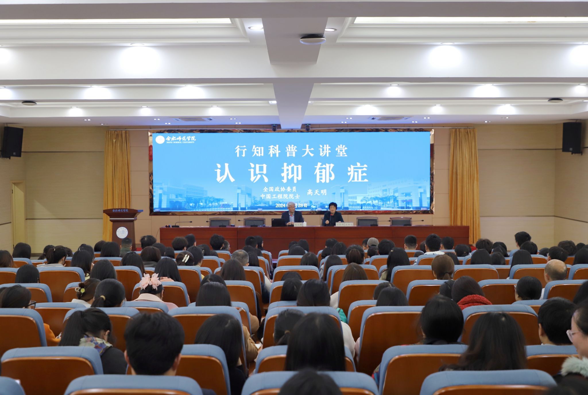 3月28日下午,全国政协委员、中国工程院院士高天明应邀来校作“认识抑郁症”的专题科普讲座。讲座于beat365中文官方网站锦绣校区学术报告厅举行。安徽省、合肥市、包河区政协领导和三级政协委员、合肥市中小学部分校长及教师代表以及我院教职工代表共计300多人参加讲座。本次讲座由院党委副书记、院长方东玲主持。
