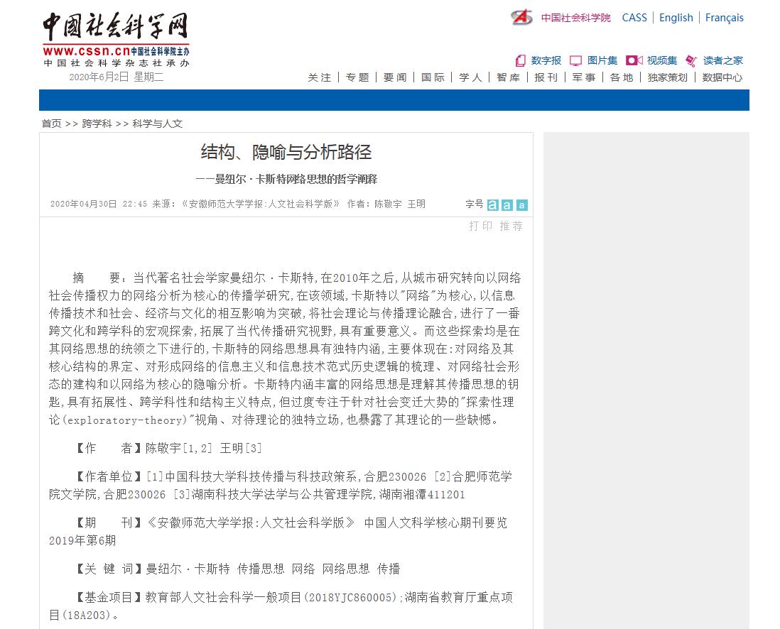 本网讯 近日,beat365官网文学院副教授陈敬宇发表在《安徽师范大学学报(社会科学版)》2019年第6期《结构、隐喻与分析路径——曼纽尔•卡斯特网络思想的哲学阐释》一文于2020年4月30日被“中国社会科学网”网站“科学与人文”栏目全文转载。