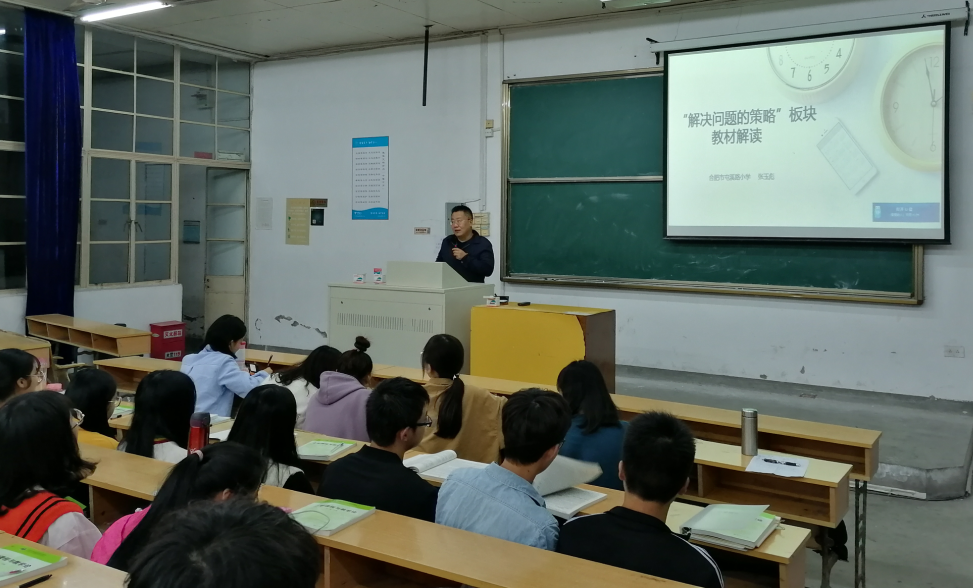 本网讯 10月23日晚,三孝口校区东阶教室灯火通明,学生满堂。教师教育学院特别邀请了合肥市骨干教师、屯溪路小学数学名师张玉彪老师,为学生们主讲题为“苏教版小学数学教材解读——以‘解决问题的策略’板块为例”的讲座。讲座由教育系翟莉老师主持,2018级小学教育专业的全体学生认真聆听了讲座。