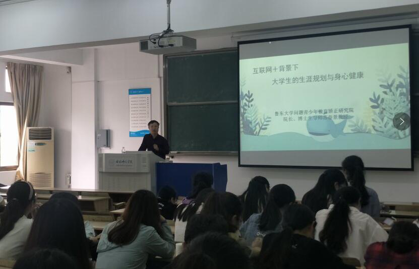本网讯 4月24日下午,鲁东大学问题青少年教育矫正研究院院长、博士生导师苏春景教授做客教师教育学院,在锦绣校区博约楼211教室为同学们作了“互联网+”背景下大学生生涯规划的理念与行动”的学术讲座。讲座由教师教育学院副院长闫龙主持,小学教育专业、学前教育专业200多名学生聆听讲座。