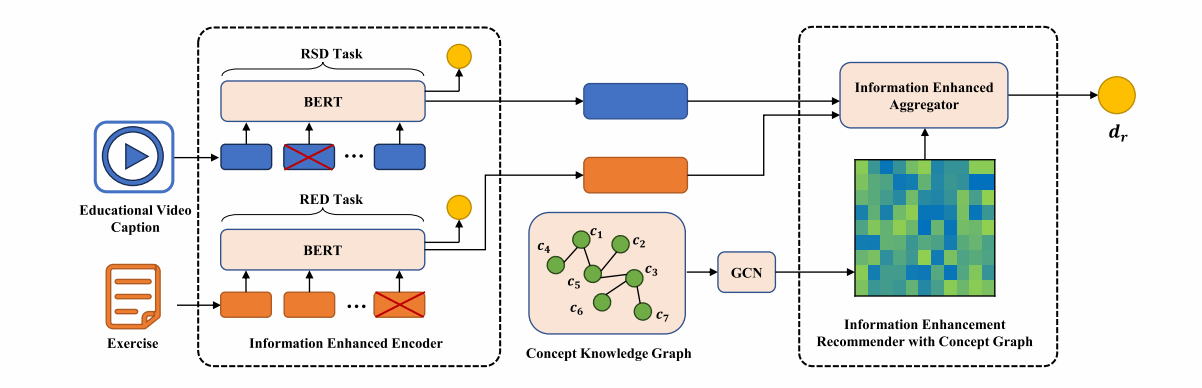 学习视频和习题是不同类型的学习资源,传统跨类型推荐方法通常将数据表征和推荐任务分离,阻碍了知识的深度融合;此外,教育资源中有效信息的不均匀分布使得传统模型难以捕捉关键语义;最后,推荐数据的稀疏性也给模型的训练和优化带来了困难。