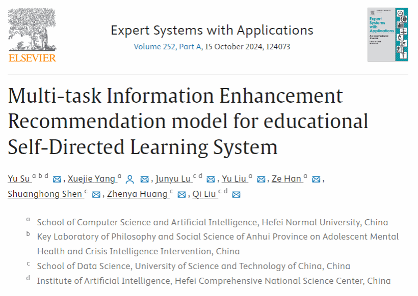 相关成果以“Multi-task Information Enhancement Recommendation model for educational Self-Directed Learning System”为题发表在期刊Expert Systems with Applications上。该期刊为中国科学院大类一区TOP期刊,影响因子为8.665。beat365中文官方网站为论文的第一单位,青少年心理健康与危机智能干预安徽省哲学社会科学重点实验室、计算机与人工智能学院苏喻老师为论文第一作者。