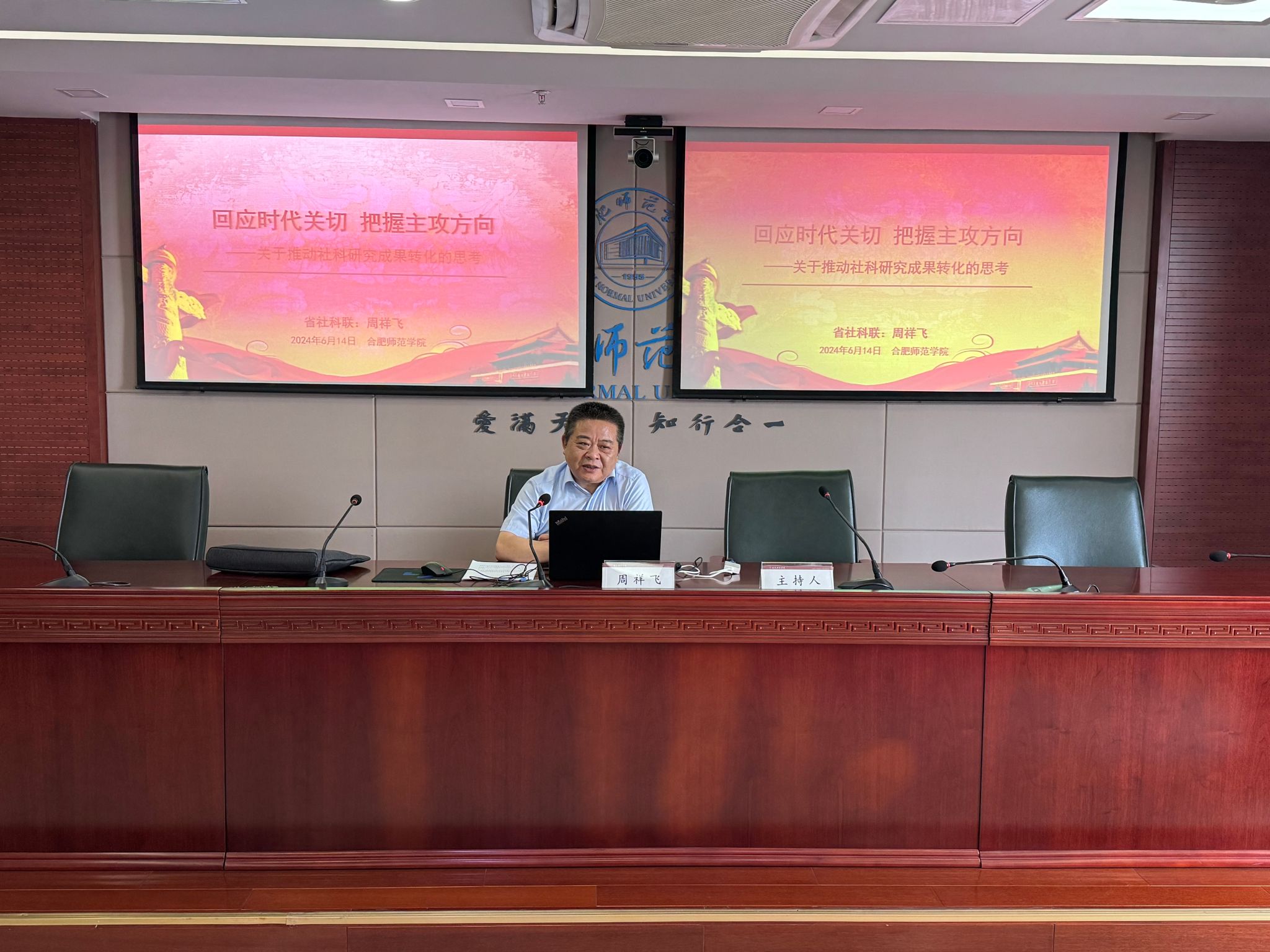 6月14日下午,安徽省社科联党组成员、副主席周祥飞应邀来院作“回应时代关切 把握主攻方向——关于推动社科研究成果转化的思考”学术讲座。院党委副书记、院长方东玲,省社科联普教咨询处(科研处)三级调研员宣国庆出席讲座。科研处、相关二级学院等单位负责人及各二级学院骨干教师代表共80余人参加讲座。讲座由科研处处长胡昂主持。