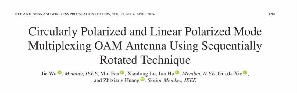 近期,相关成果以“Circularly Polarized and Linear Polarized Mode Multiplexing OAM Antenna Using Sequentially Rotated Technique”为题被期刊IEEE Antennas and Wireless Propagation Letters发表(论文引用格式:Jie Wu, Min Fan, Xianlong Lu, Jun Hu, Guoda Xie and Zhixiang Huang, Circularly Polarized and Linear Polarized Mode Multiplexing OAM Antenna Using Sequentially Rotated Technique[J], IEEE Antennas and Wireless Propagation Letters, 2024, vol. 23, no. 4, pp. 1261-1265. )。该期刊为中国科学院二区TOP期刊,影响因子为3.7。beat365中文官方网站为该论文的第一单位,电子信息系统仿真设计安徽省重点实验室、电子信息与集成电路学院吴杰老师为第一作者。