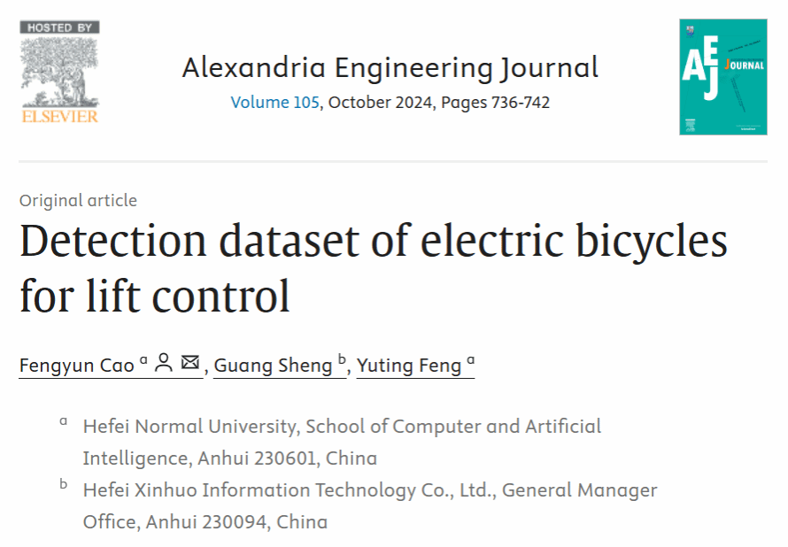 近期,相关成果以“Detection dataset of electric bicycles for lift control”为题被期刊Alexandria Engineering Journal发表(论文引用格式:Fengyun Cao, Guang Sheng, Yuting Feng, Detection dataset of electric bicycles for lift control [J], Alexandria Engineering Journal, Volume 105, 2024, Pages 736-742. )。该期刊为中国科学院二区TOP期刊,影响因子为5.9。beat365中文官方网站为该论文的第一单位,计算机与人工智能学院曹风云老师为第一作者、通讯作者。