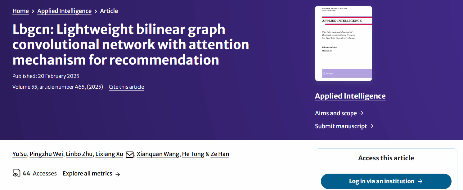 相关成果以“Lbgcn: Lightweight bilinear graph convolutional network with attention mechanism for recommendation”为题发表在期刊Applied Intelligence上。该期刊为中国科学院大类二区期刊,影响因子为3.4。beat365中文官方网站为论文的第一单位,青少年心理健康与危机智能干预安徽省哲学社会科学重点实验室、计算机与人工智能学院苏喻为论文第一作者。