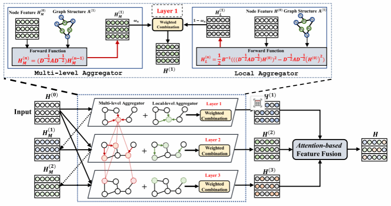 随着图神经网络(GNN)在推荐系统中的应用,研究者们提出了许多基于图的推荐方法。图神经网络通过图结构将用户、物品及其之间的交互关系进行建模,从而能够捕捉到更丰富的用户兴趣特征和物品属性信息。尽管GNN在推荐系统中展现了强大的潜力,现有的方法仍然存在一些不足之处。首先,许多模型在处理节点间的交互时,采用简单的加权求和方式进行邻居信息聚合,忽视了节点间复杂的局部交互关系,这使得信息传递过程中的有效性和准确性受限。其次,现有的GNN模型大多专注于全局结构,却缺乏对局部信息的充分捕捉,未能深入建模节点之间多层次的关系,进而制约了模型性能的进一步提升。