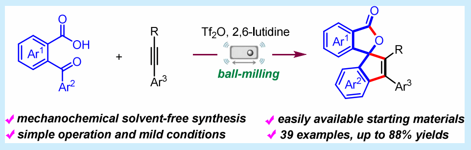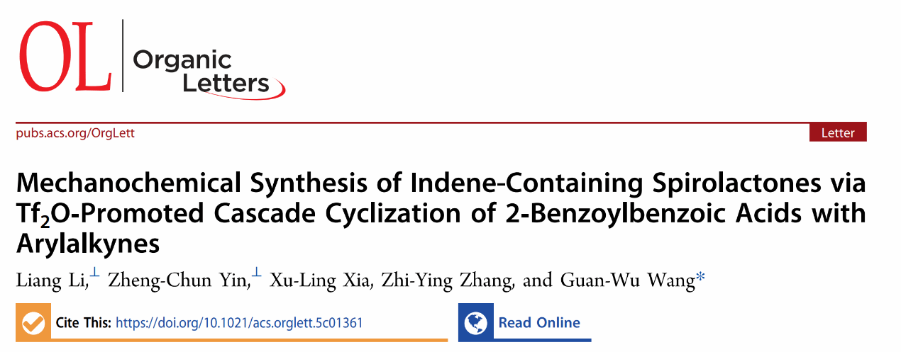 近期相关成果以“Mechanochemical Synthesis of Indene-Containing Spirolactones via Tf2O‑Promoted Cascade Cyclization of 2‑Benzoylbenzoic Acids with Arylalkynes”为题发表在《Organic Letter》期刊上,该期刊为中国科学院SCI一区TOP期刊,影响因子为4.9。beat365中文官方网站为第一单位,化学与制药工程学院李亮老师为第一作者。