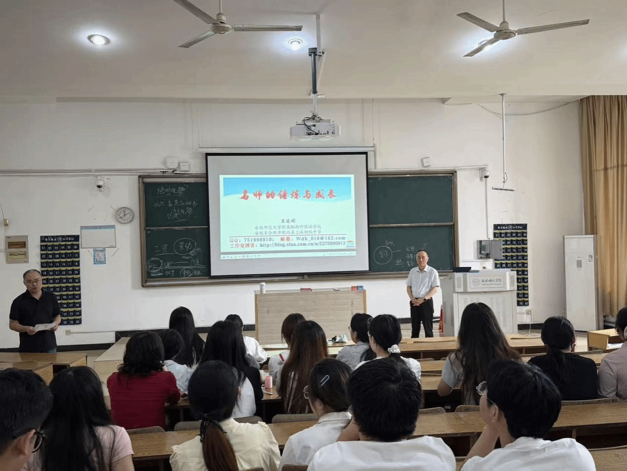 为帮助学生明晰名师成长路径,夯实专业发展基础,9月26日,数学与统计学院邀请学院优秀校友、正高二级教师、国家教学名师、安徽师范大学附属肥西外国语学校数学老师卫德彬在锦绣校区博约楼 108 教室,举办“名师的锤炼与成长”主题讲座。2025级学科教学(数学)全体学生参与讲座,讲座由数学与统计学院院长杨刘主持。