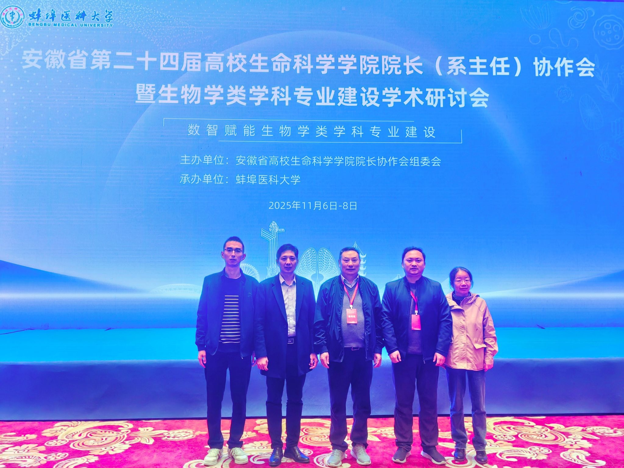 2025年11月6日-7日,beat365中文官方网站原党委副书记、副校长、安徽省大学生生物标本制作大赛专家委员会主任李进华教授、生物与食品工程学院副院长陈金武、实验室主任耿明、朱勇教授和张启信博士一行5人参加由安徽省高校生命科学学院院长协作会组委会主办、蚌埠医科大学承办的“安徽省第二十四届高校生命科学学院院长协作会暨生物学类学科专业建设学术研讨会”。大会以“数智赋能生物学类学科专业建设”为主题,来自全省21所本科高校的100余位院长、系主任、专家学者及教师代表参会。