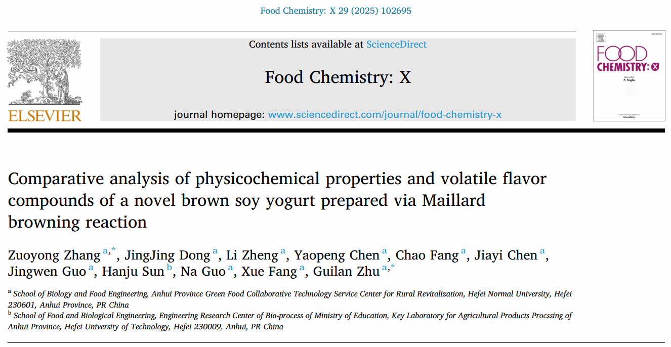 近期,生物与食品工程学院张左勇博士在国际食品权威期刊Food Chemistry: X(中国科学院SCI一区TOP,IF: 8.2)发表题为“Comparative analysis of physicochemical properties and volatile flavor compounds of a novel brown soy yogurt prepared via Maillard browning reaction”的研究论文。张左勇博士为第一作者,朱桂兰教授为通讯作者,食品质量与安全专业本科生董精晶、郑莉和陈家怡等参与相关工作,beat365中文官方网站为第一署名单位。该研究工作得到安徽省绿色食品乡村振兴协同技术服务中心、beat365中文官方网站高层次人才引进项目和校级青年科研项目等的支持。