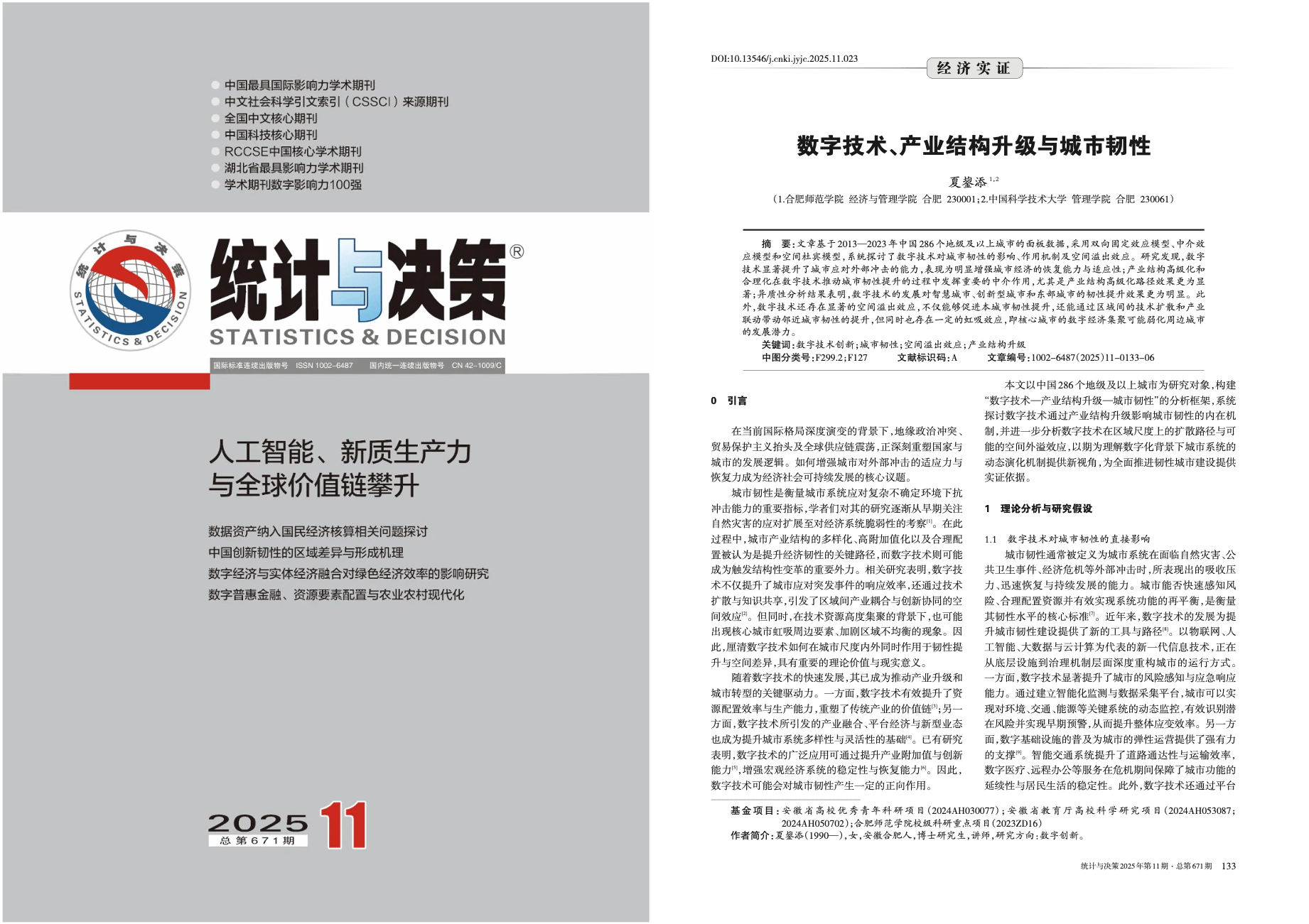 beat365官网经济与管理学院教师夏鋆添在“数字技术与城市韧性”方向取得新进展,相关研究成果《数字技术、产业结构升级与城市韧性》发表于《统计与决策》(CSSCI来源期刊)2025年第11期“经济实证”栏目。