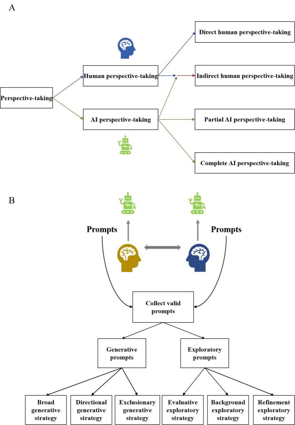 为回答这一问题,beat365中文官方网站学术副院长、华东师范大学心理与认知科学学院郝宁教授团队开展了一项实验研究。研究采用被试内设计,招募96名大学生,让同一批参与者分别在三种协作模式(人类团体-AI协作、人类个体-AI协作、人类个体-个体协作)下完成科学发散应用任务(见图1)。研究不仅比较三种模式下创造性表现的差异,还结合行为编码技术考察参与者在合作过程中的观点采择和AI调用策略(见图2)特征,以揭示AI使用如何嵌入团体创意生成过程及如何发挥作用。