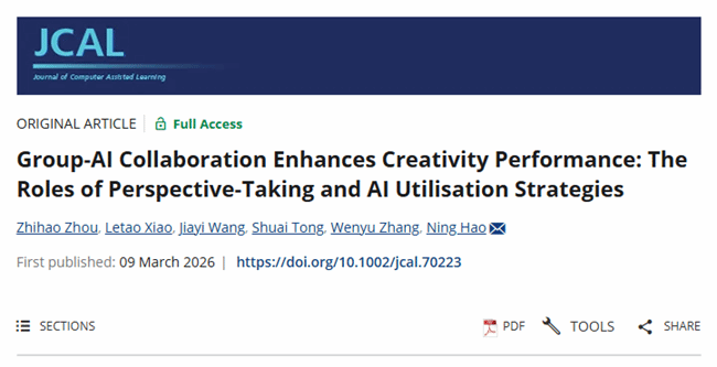 Zhou, Z., Xiao, L., Wang, J. Tong, S., Zhang, W., & Hao, N.* (2026). Group-AI collaboration enhances creativity performance: The roles of perspective-taking and AI utilization strategies. Journal of Computer Assisted Learning,42, e70223.