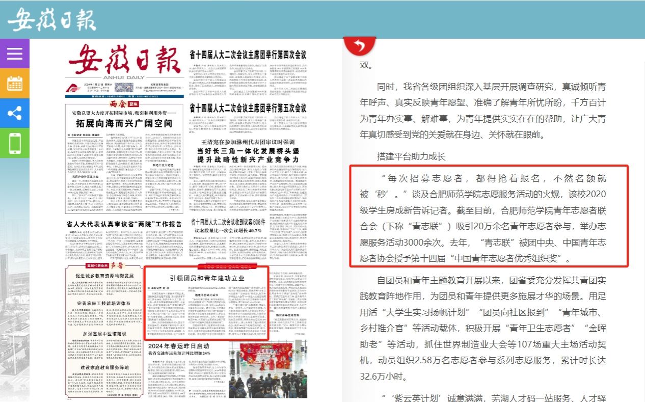 1月27日,安徽日报在头版刊发《引领团员和青年建功立业》一文,文中对我院青年志愿服务有关工作进行了报道。(院团委)