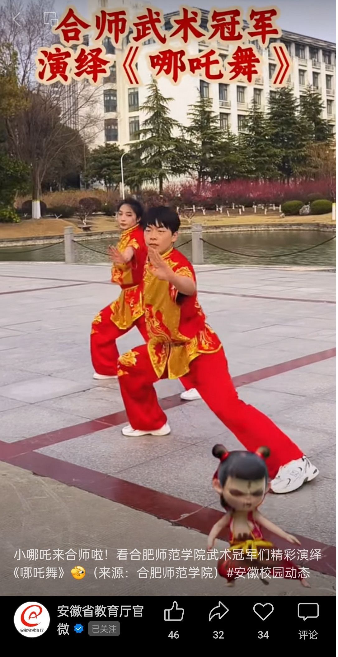 【安徽省教育厅官微】安徽省教育厅官微视频号发布beat365官网武术冠军演绎哪吒舞视频