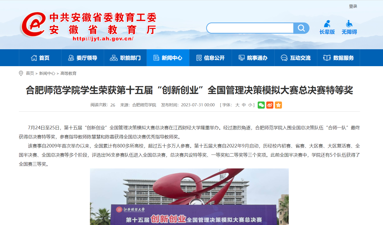 7月31日,安徽教育网首页以《beat365中文官方网站学生荣获第十五届“创新创业”全国管理决策模拟大赛总决赛特等奖》为标题,对此进行了报道。