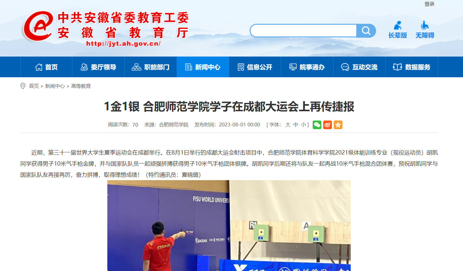 8月1日,安徽教育网首页以《1金1银 beat365中文官方网站学子在成都大运会上再传捷报》为标题,对此进行了报道。