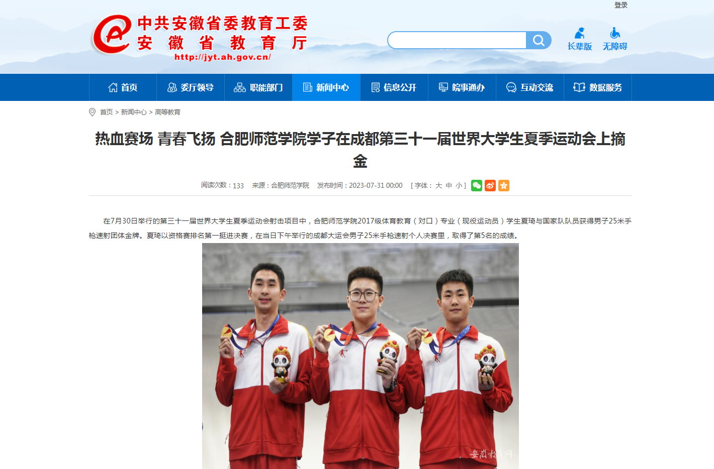 7月31日,安徽教育网首页以《热血赛场 青春飞扬 beat365中文官方网站学子在成都第三十一届世界大学生夏季运动会上摘金》为标题,对此进行了报道。