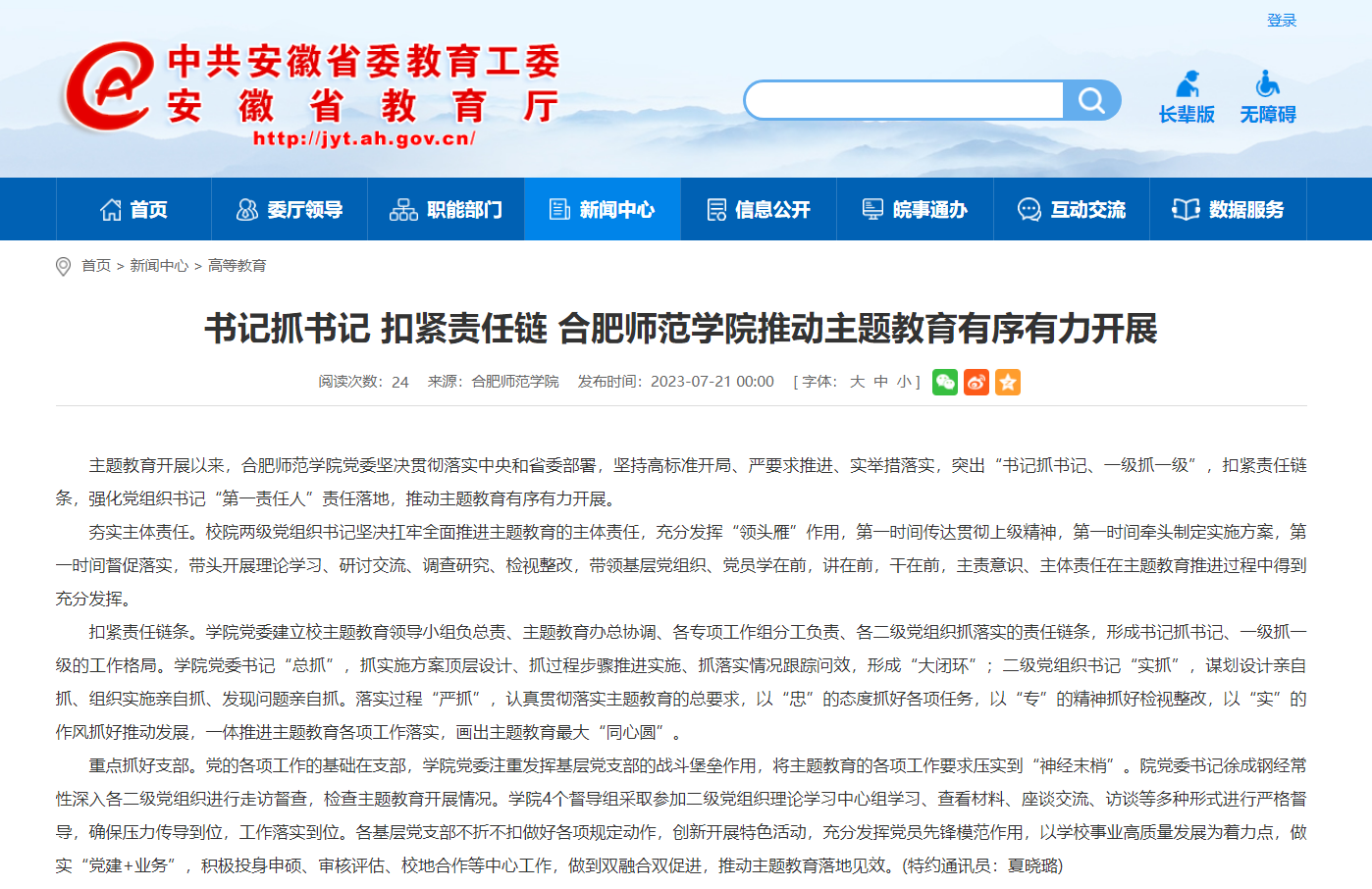 7月21日,安徽教育网以《书记抓书记 扣紧责任链 beat365中文官方网站推动主题教育有序有力开展》为标题,对此进行了报道。